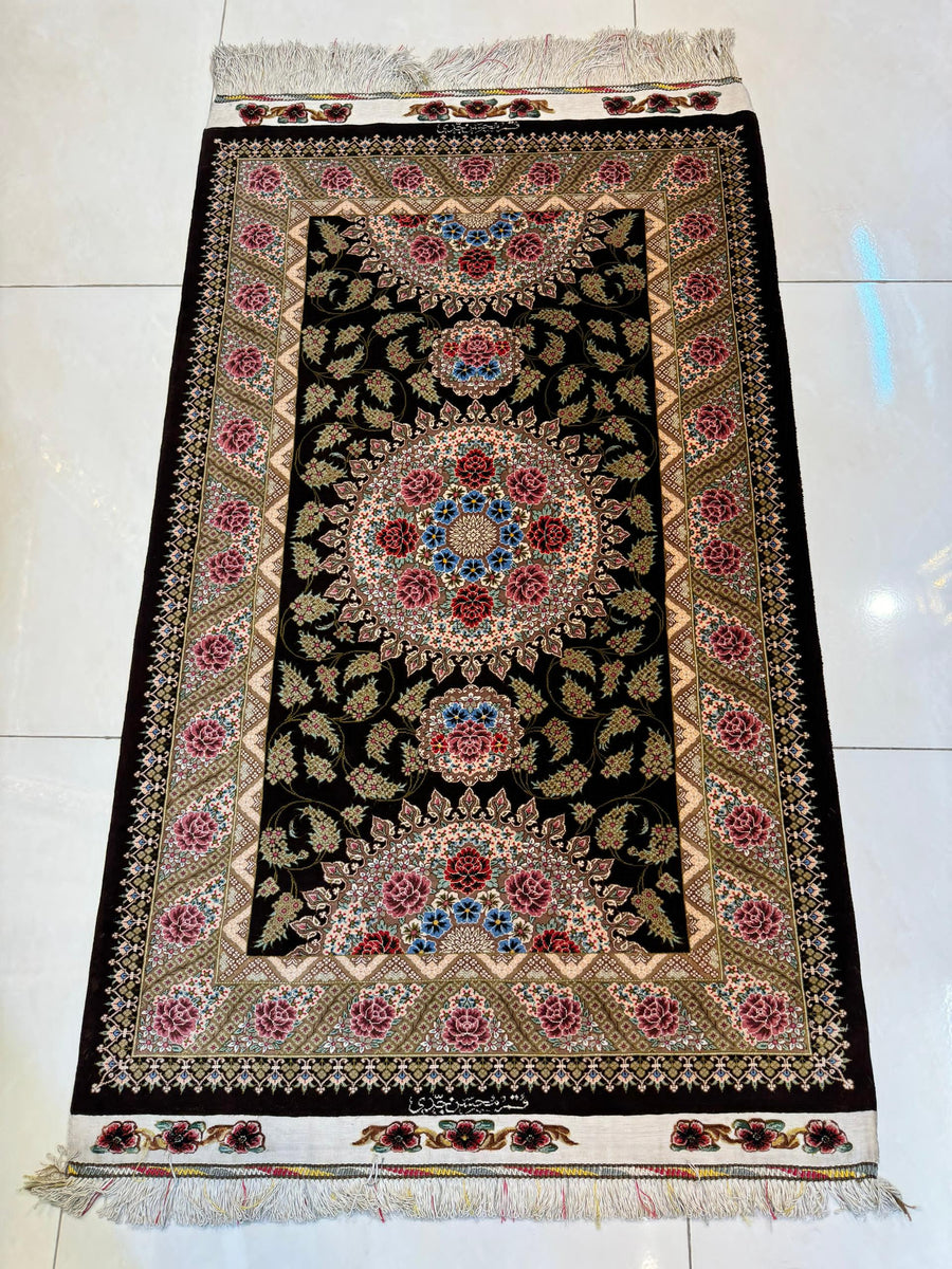 驚くような細かな織り目とビロードのような生地、肌に吸い付くようなシルクの艶やかな光沢感が豪華絢爛。まさに、「The ペルシャ絨毯」と言うべき最高峰のペルシャ絨毯は、もはや工芸品ではなく美術品としての価値となります。ジャディ工房のサイン入り。シルクの絨毯は毛足の光沢が見る向きによってまったく趣の異なる色合いになりますので、敷く際は向きを調整してください。