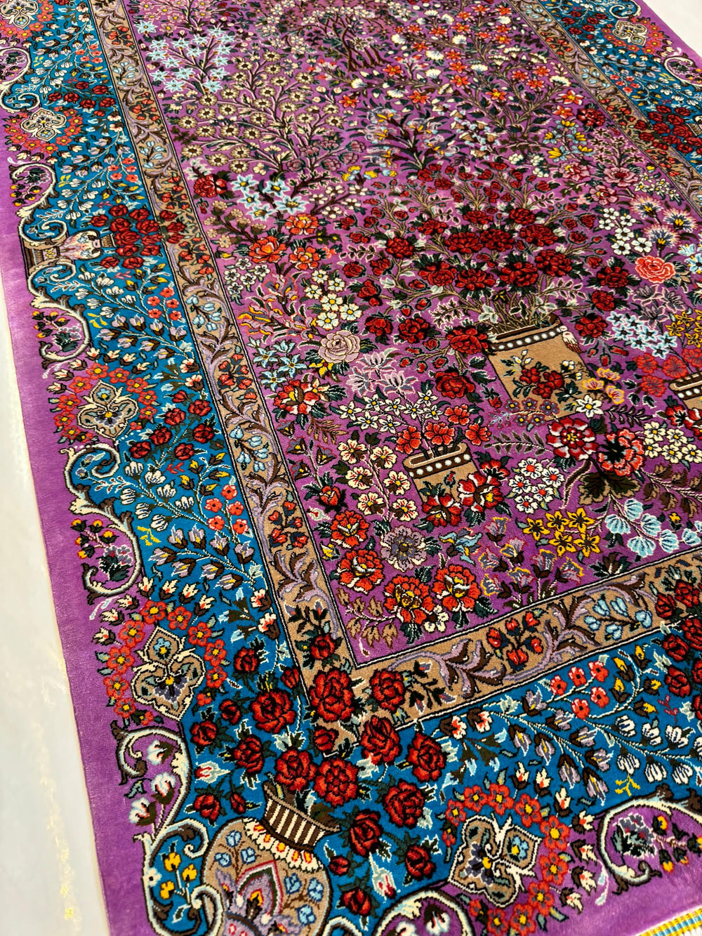 驚くような細かな織り目とビロードのような生地、肌に吸い付くようなシルクの艶やかな光沢感が豪華絢爛。まさに、「The ペルシャ絨毯」と言うべき最高峰のペルシャ絨毯は、もはや工芸品ではなく美術品としての価値となります。ハジ・ホセイニのサイン入り。シルクの絨毯は毛足の光沢が見る向きによってまったく趣の異なる色合いになりますので、敷く際は向きを調整してください。