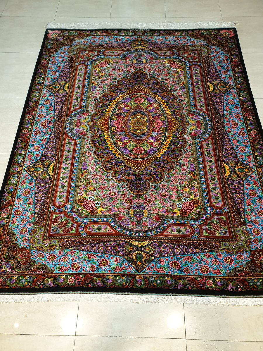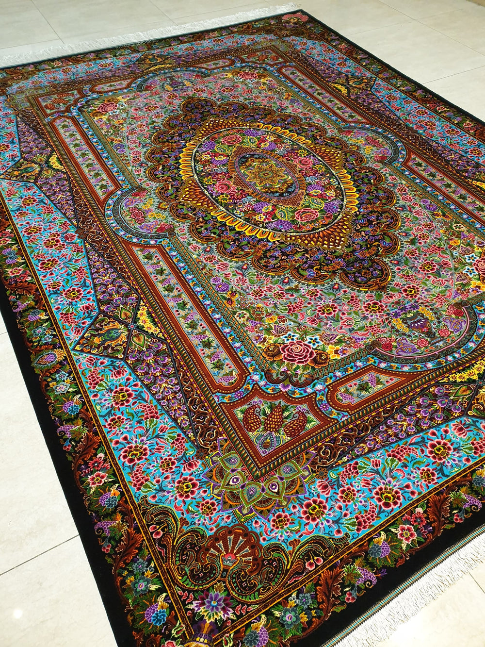 鮮やかでカラフルなバラのモチーフが描かれたエレガントなペルシャ絨毯です。美しい花柄が緻密に織り込まれ、圧倒的な存在感と上品な雰囲気を兼ね備えています。伝統的な美しさと現代的なデザインが融合した、魅力的な一枚です。