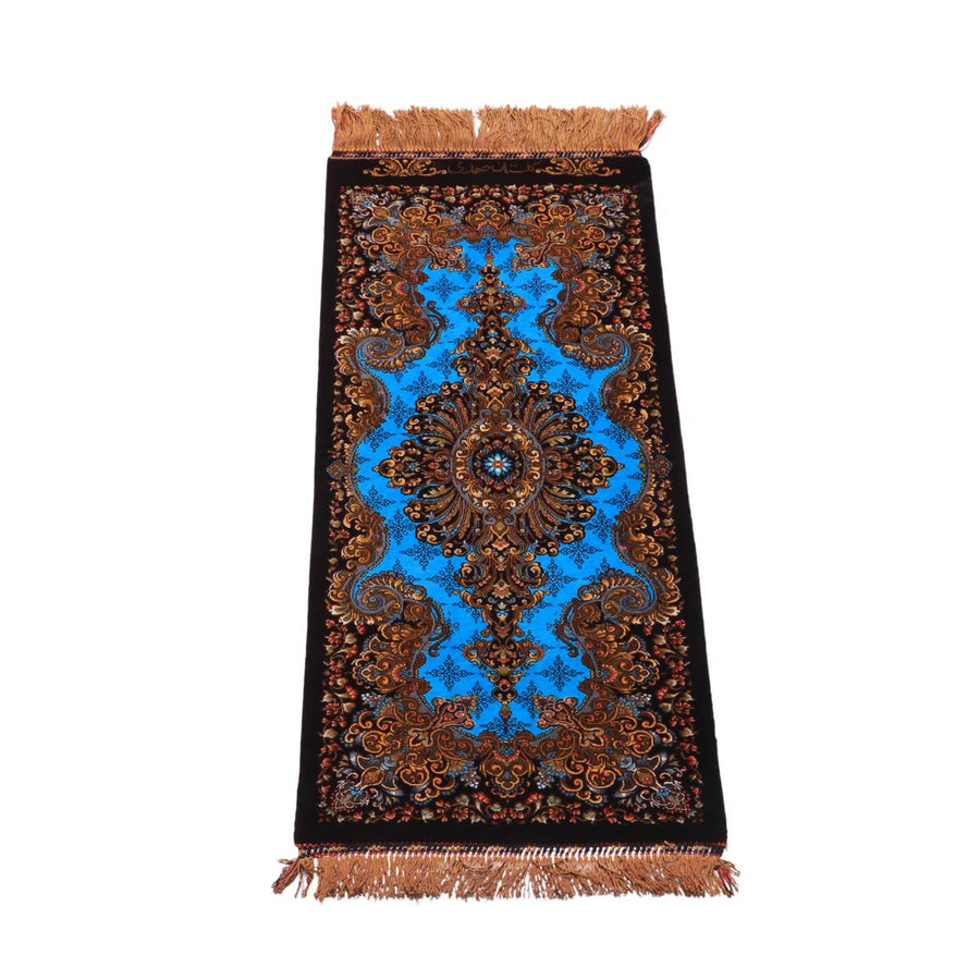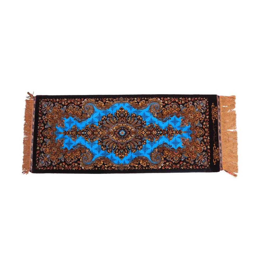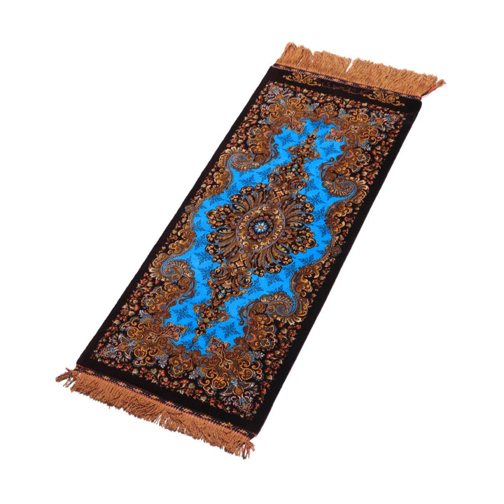 デザインの魅力:中央メダリオンを軸に渦巻く唐草が左右対称に広がる端正な構図。縦長のランナーとして廊下やベッドサイドにすっきり映えます。