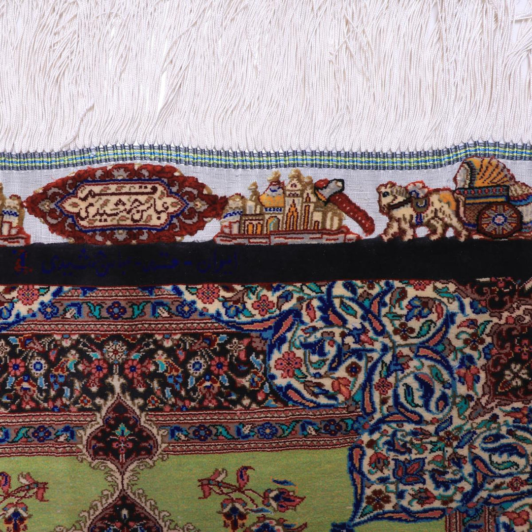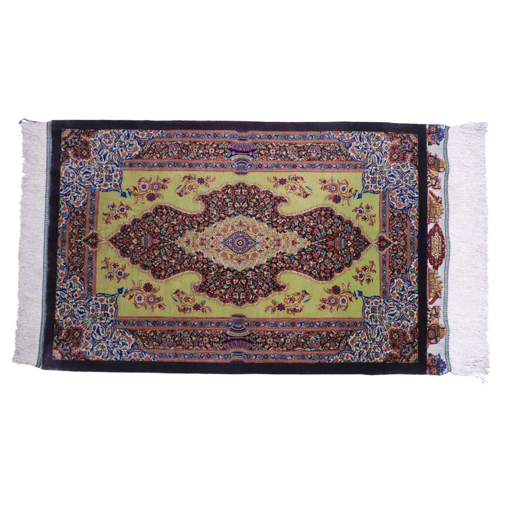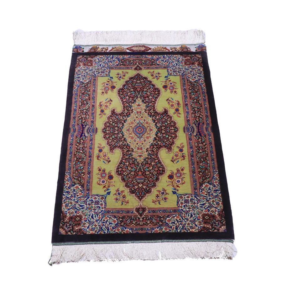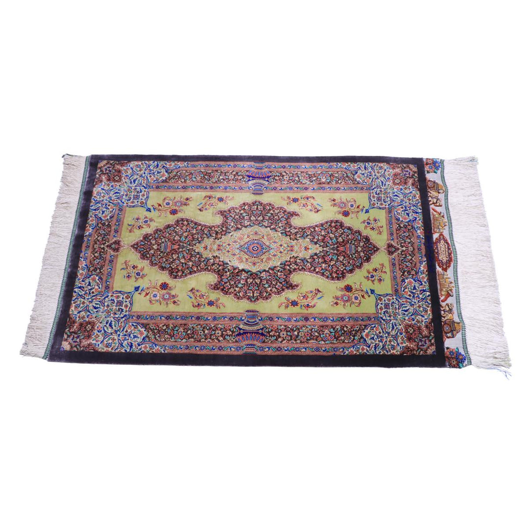 デザインの魅力:黄緑のフィールドに曲線的メダリオンと花模様を端正に配置。対称のバランスが良く、敷いても壁掛けでもすっきり映えます。