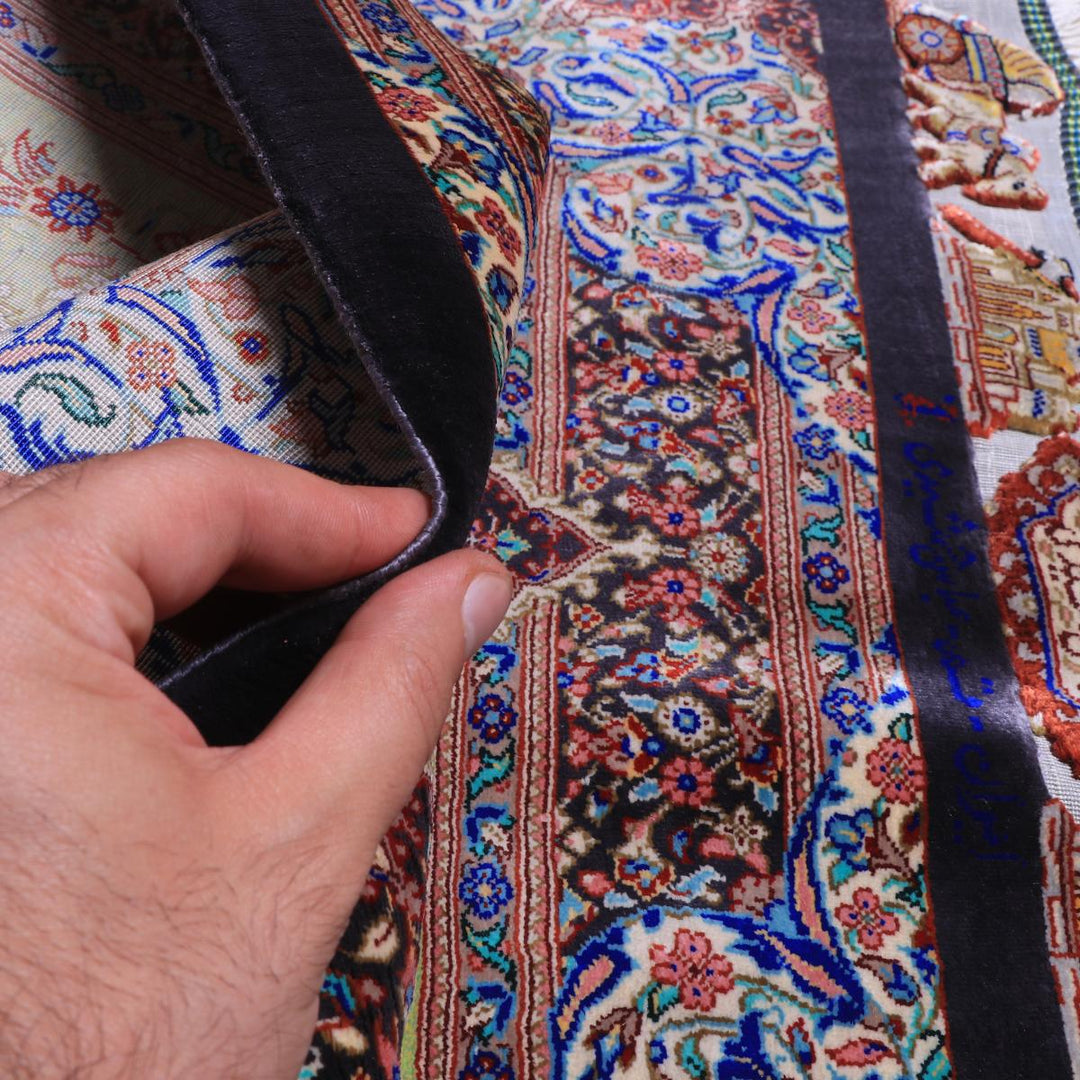 質感の良さ:シルク100%のきめ細かな毛並み。指で撫でるとすっと流れ、光で艶がやわらかく変化。さらりと軽い踏み心地です。