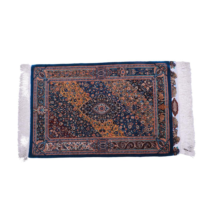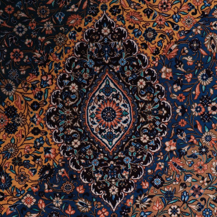 デザインの魅力:斜めに切り替えた金色と藍のフィールドに小花がびっしり。菱形メダリオンと細い枠が全体をきりっと整えます。