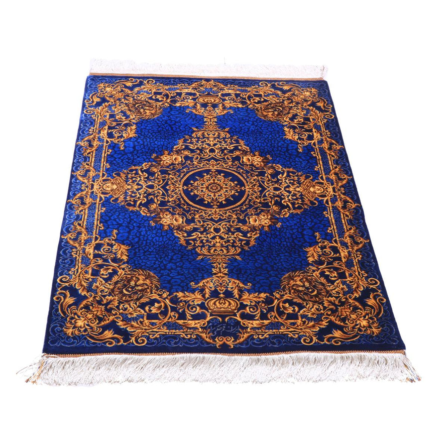 デザインの魅力:金のアラベスクが四隅から中心へ結ぶ端正な構図。円花が際立ち、敷くだけで空間がきゅっと締まります。