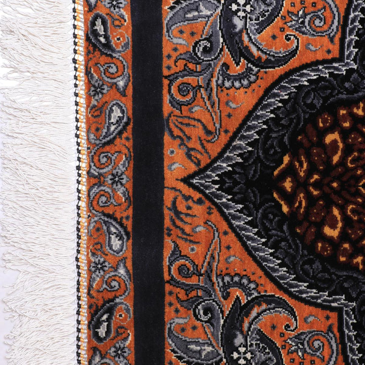 色:焦茶のフィールドにテラコッタの枠、灰銀のモチーフが映えます。黒の輪郭が全体を締め、温かく落ち着いた雰囲気にまとまります。