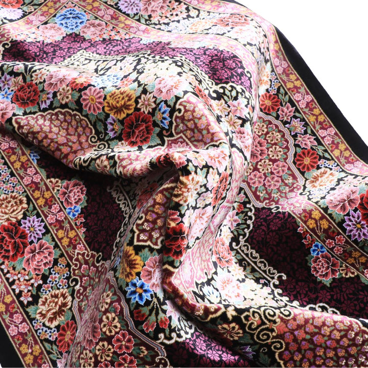 色:深いワイン地にローズや藤、生成り、空色が点在。黒の縁取りと金の細線がきりっと締まり、やわらかな華やぎが出ます。