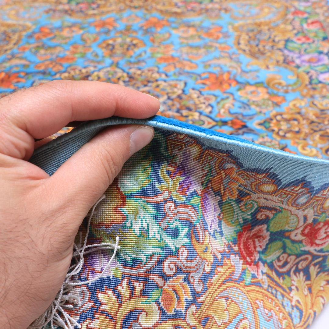 質感の良さ:シルク100%のきめ細かな毛並み。指で撫でると流れが変わり、光で艶がやわらかく移ろう、さらりと心地よい踏み心地です。