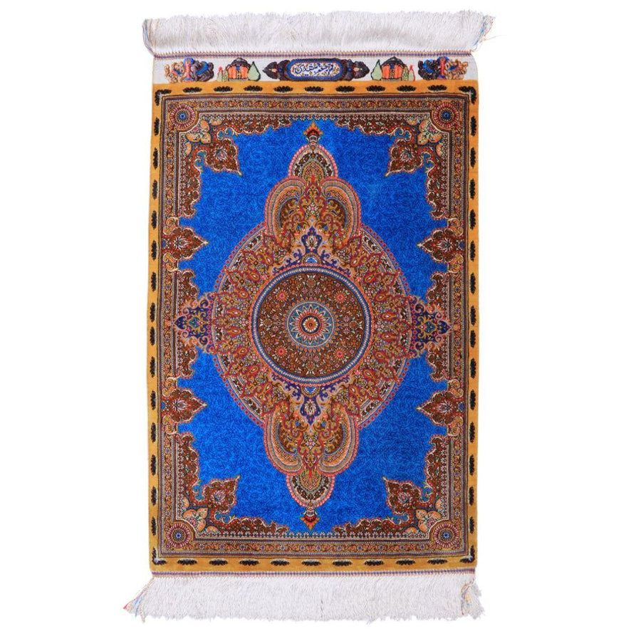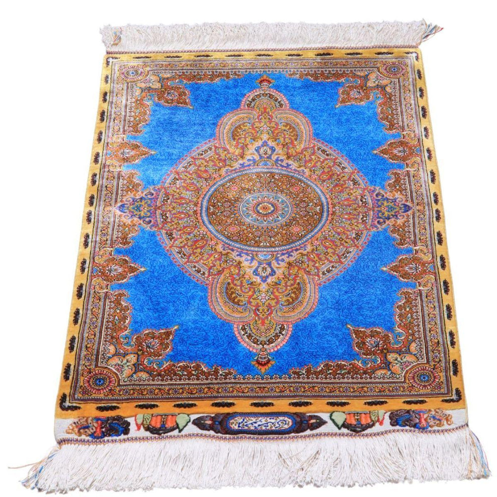デザインの魅力:澄んだ青の広いフィールドに円形メダリオンを重ね、蜂蜜色の額縁で引き締めました。敷いても壁掛けにもすっきり決まります。