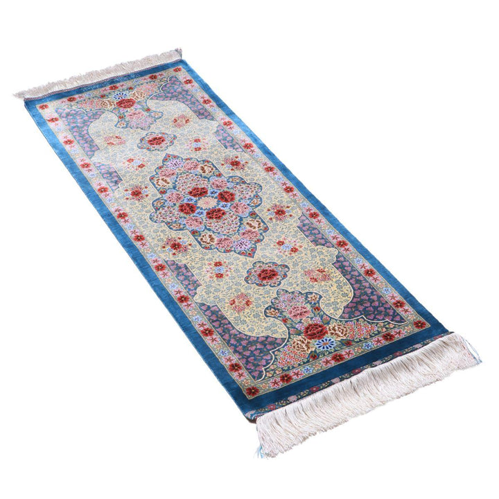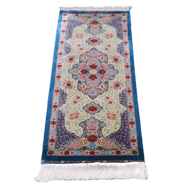 デザインの魅力:細長いランナーに、アーチ形のフィールドと花のメダリオンが連なる端正な構図。左右対称で、玄関や廊下にもすっきり決まります。