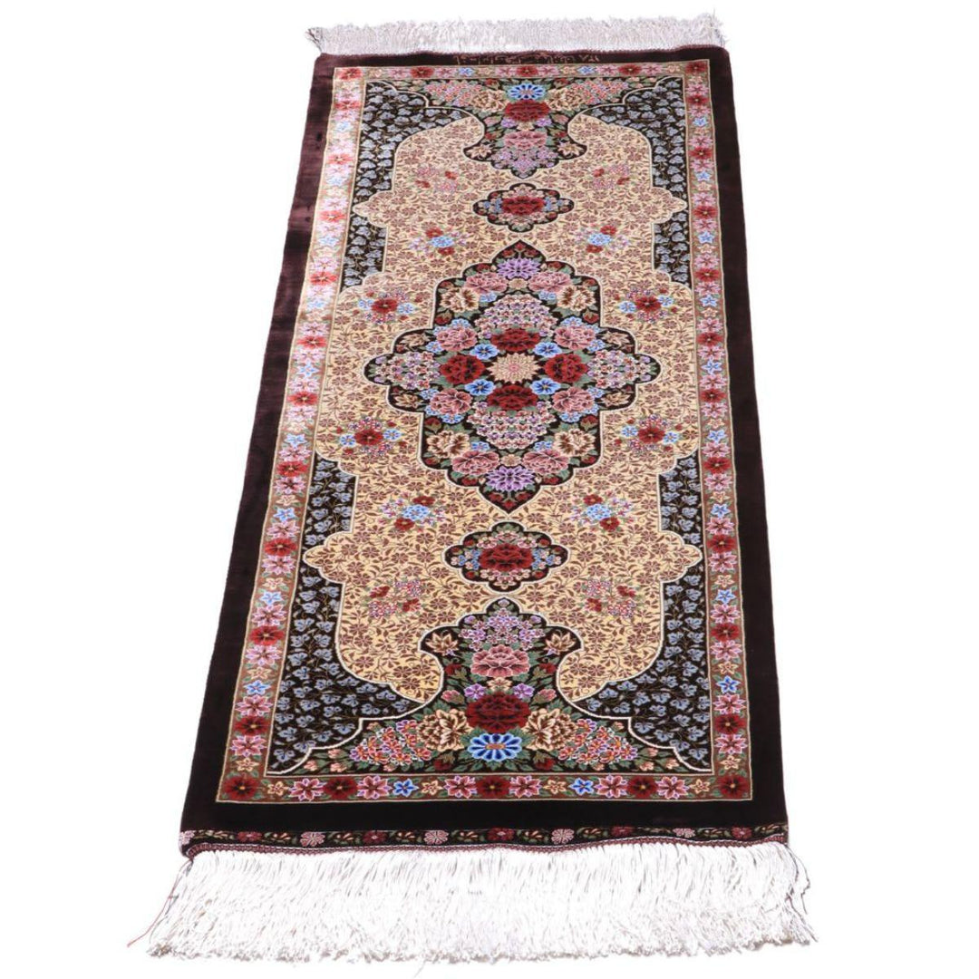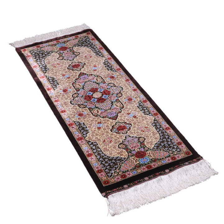 デザインの魅力:細長いランナーに曲線のフィールドと花メダリオンが連なります。両側の濃色パネルがきりっと締まり、玄関や廊下にすっきり収まります。