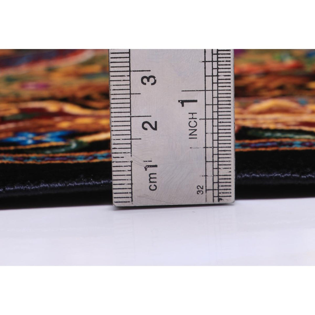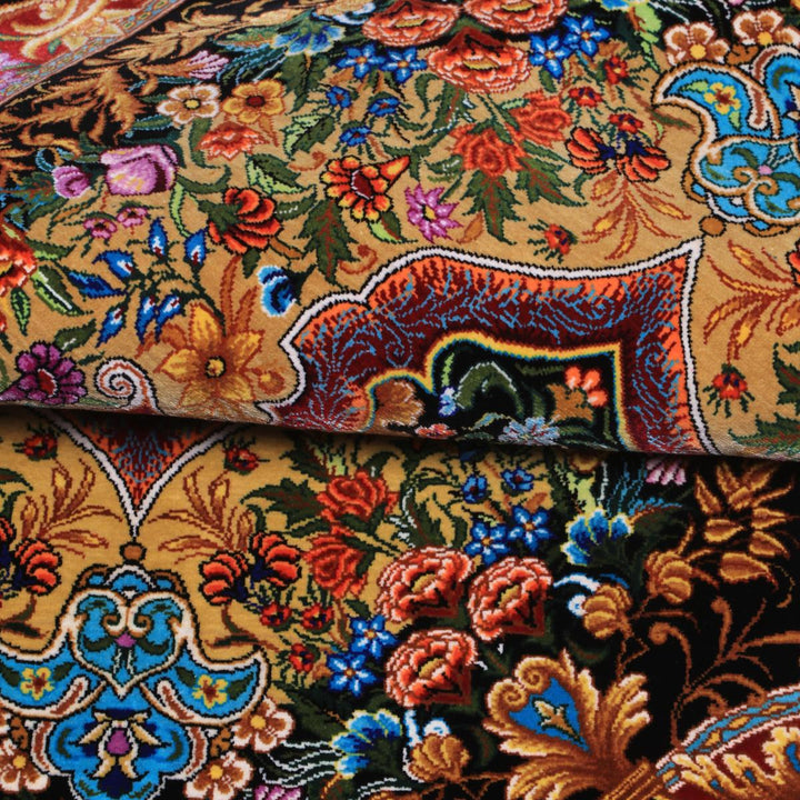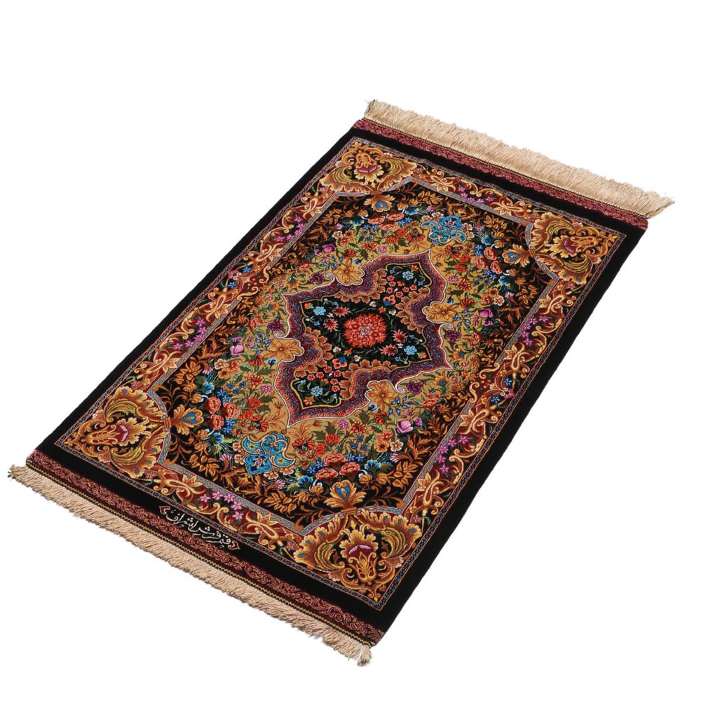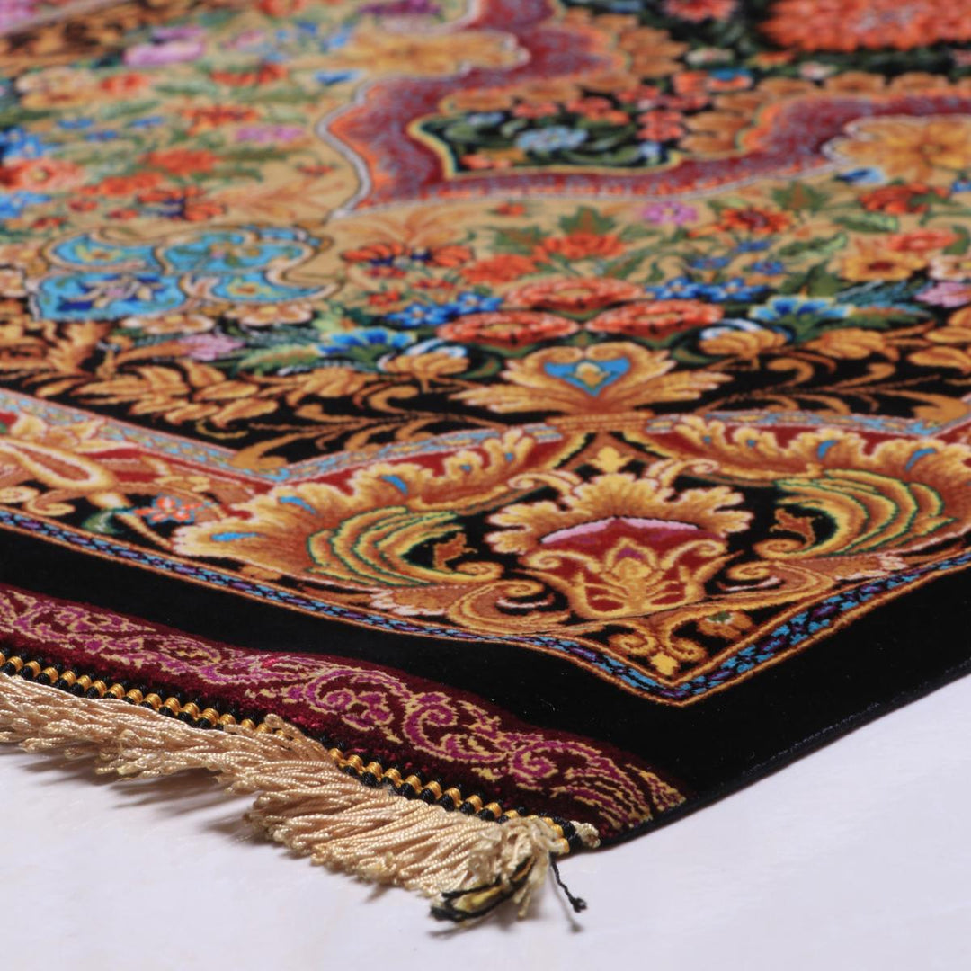 デザインの魅力:漆黒のフィールドに星形メダリオンと四隅の飾りを配し、花葉をびっしり敷き詰めた構図。重ねた額縁で全体がきゅっと整います。