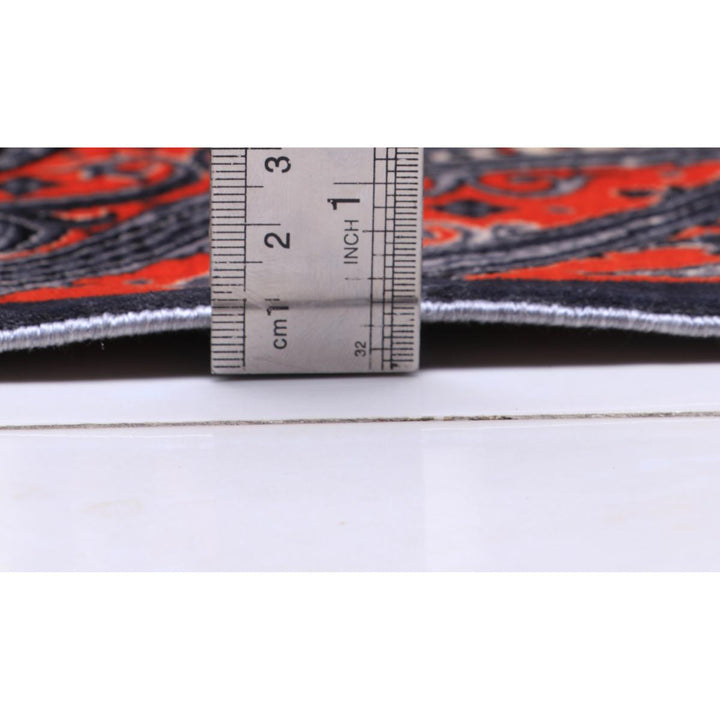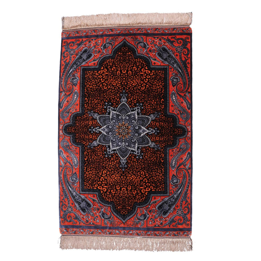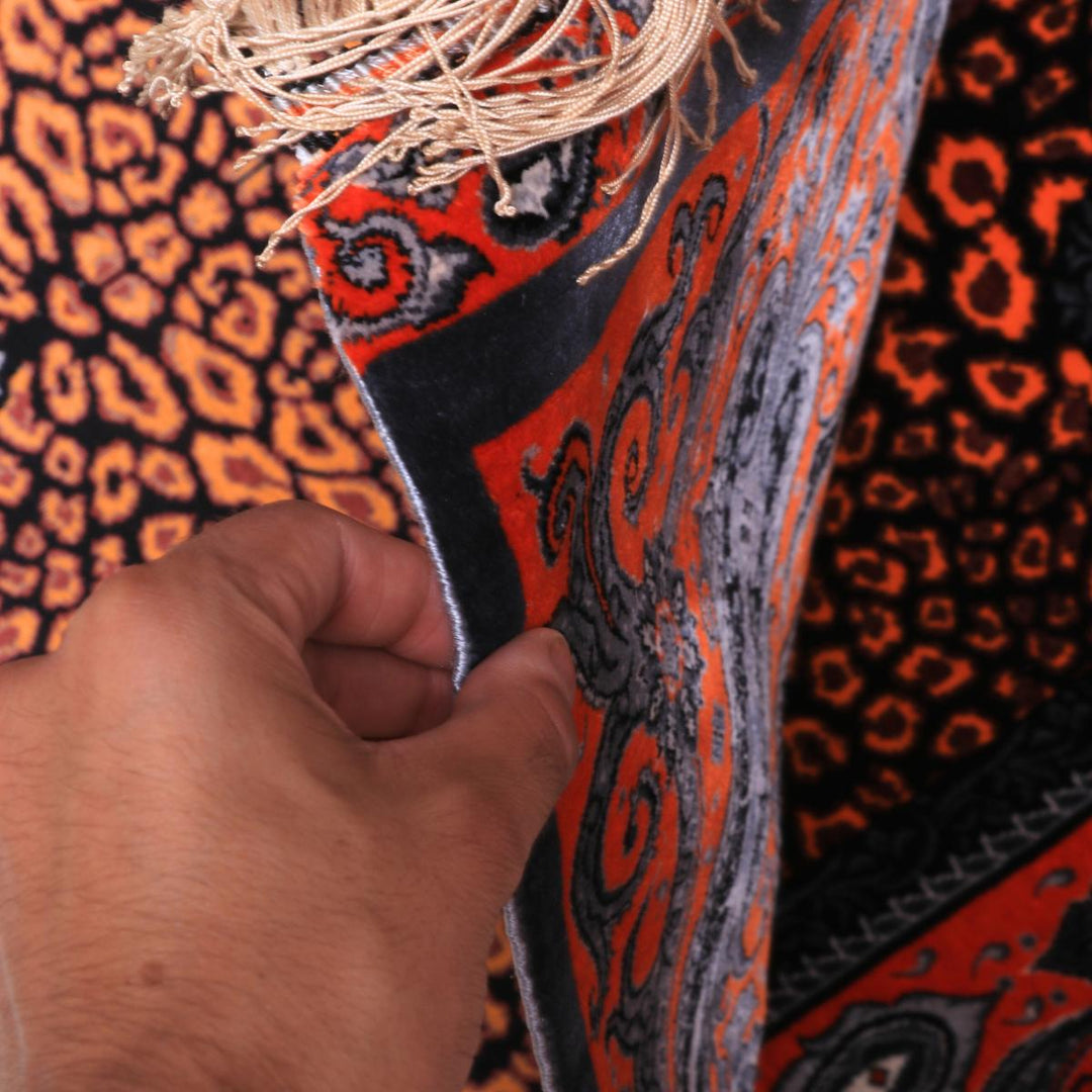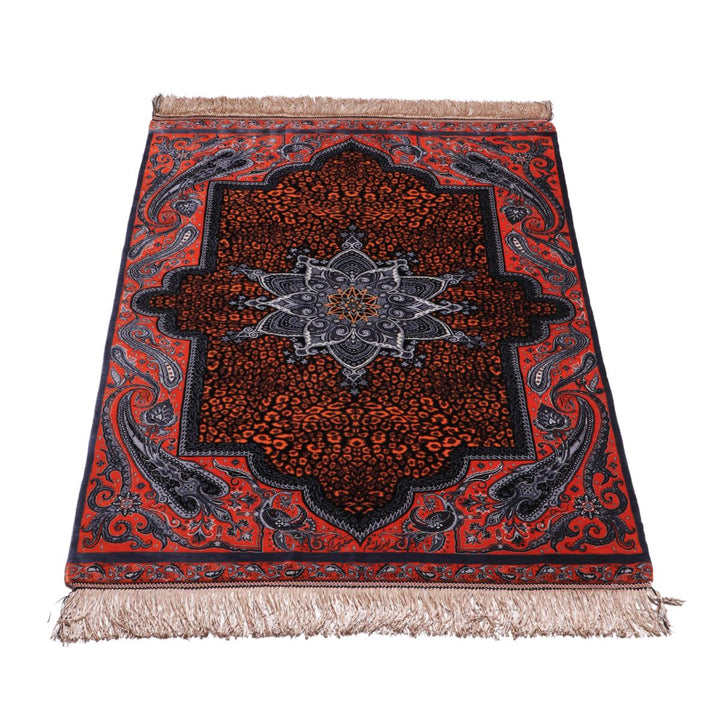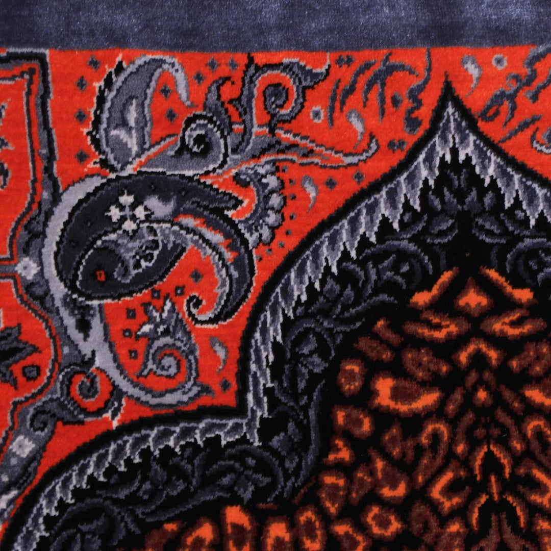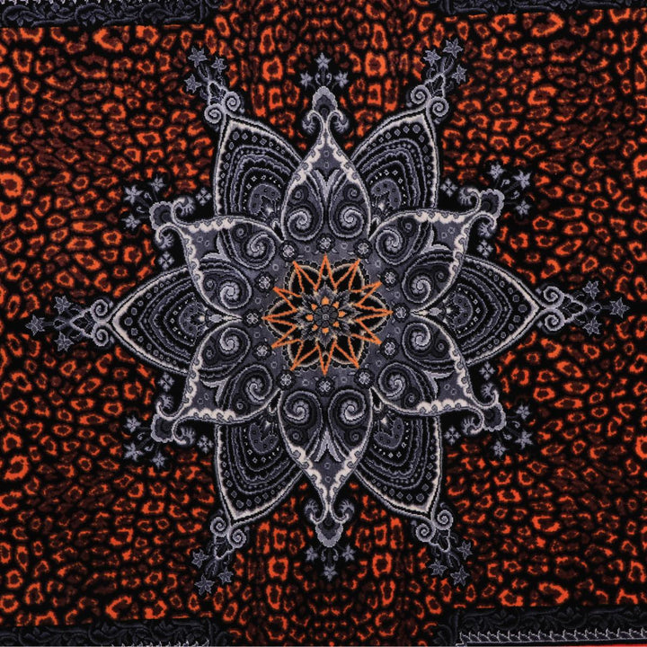 デザインの魅力:中央の花形メダリオンとペイズリーが対称に広がり、空間を引き締めます。細かな文様が視線を集め、敷くだけでほどよい存在感。