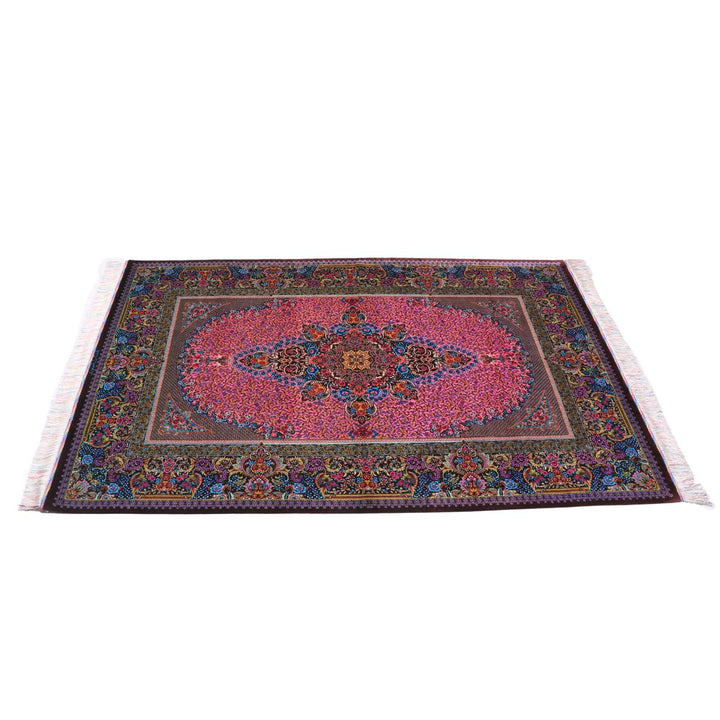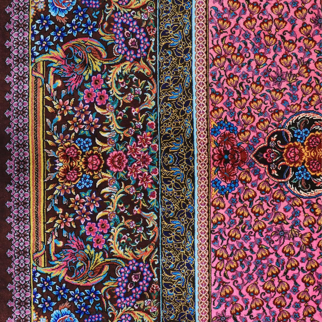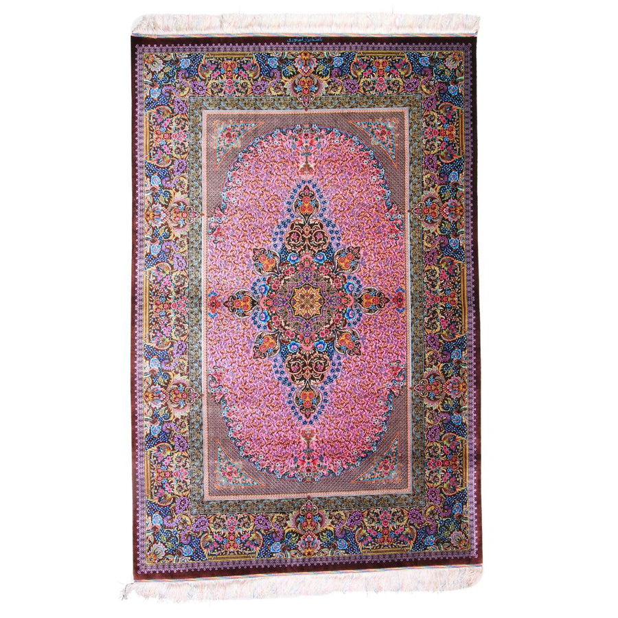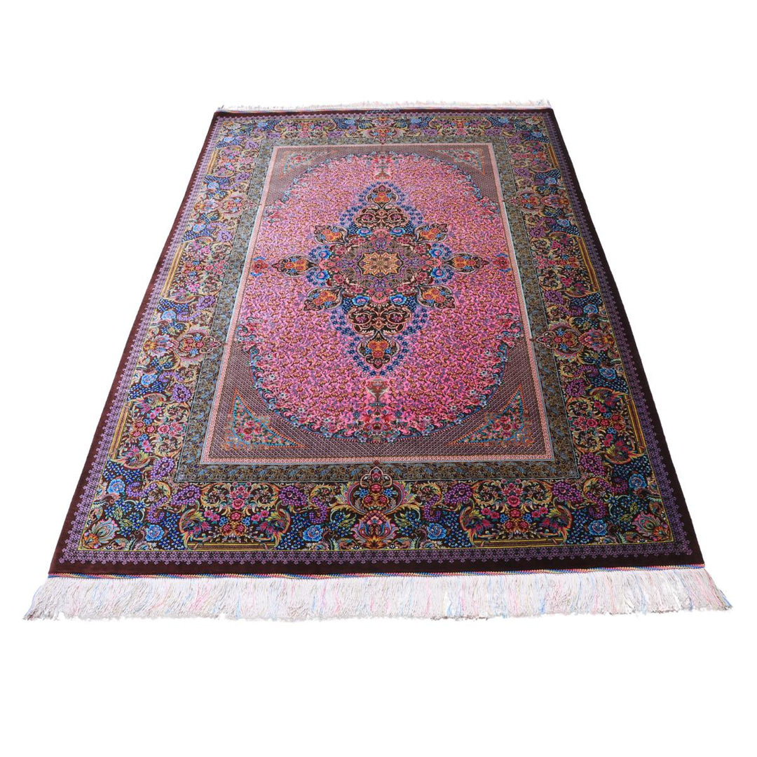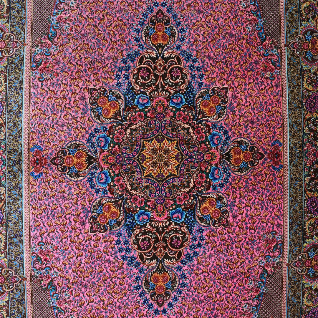 デザインの魅力:楕円メダリオンを中心に微細な花々が一面に咲く構図。太めの額縁柄が全体を整え、敷くとお部屋がぱっと明るく見えます。