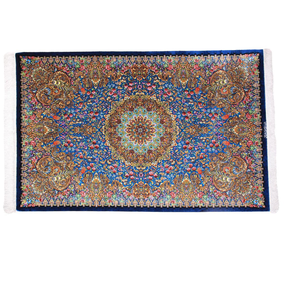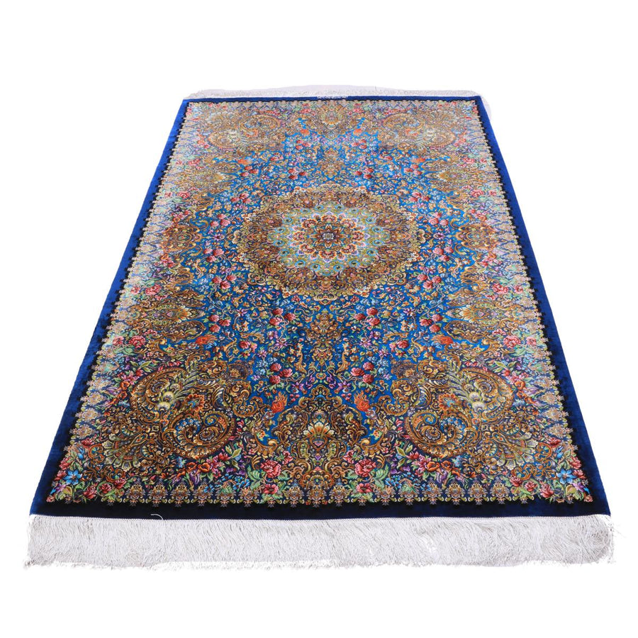 デザインの魅力:中央の円形メダリオンから花唐草が放射状に広がります。四隅の渦文がリズムを生み、敷くだけで品よくまとまります。
