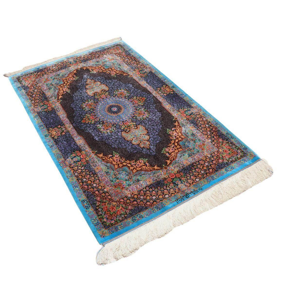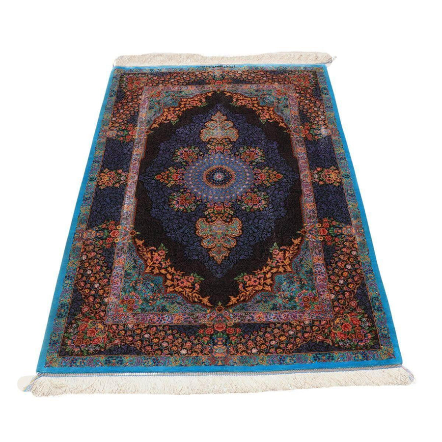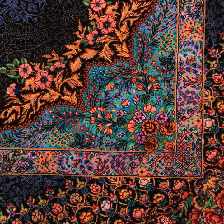 デザインの魅力:濃紺のフィールドに円形メダリオンとひし形の座を重ね、花文が波のように広がります。視線を自然に中央へ集め、端正な印象です。