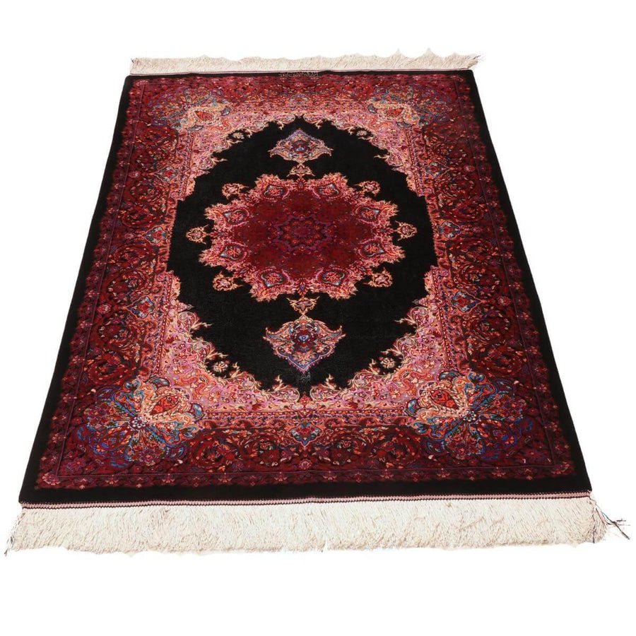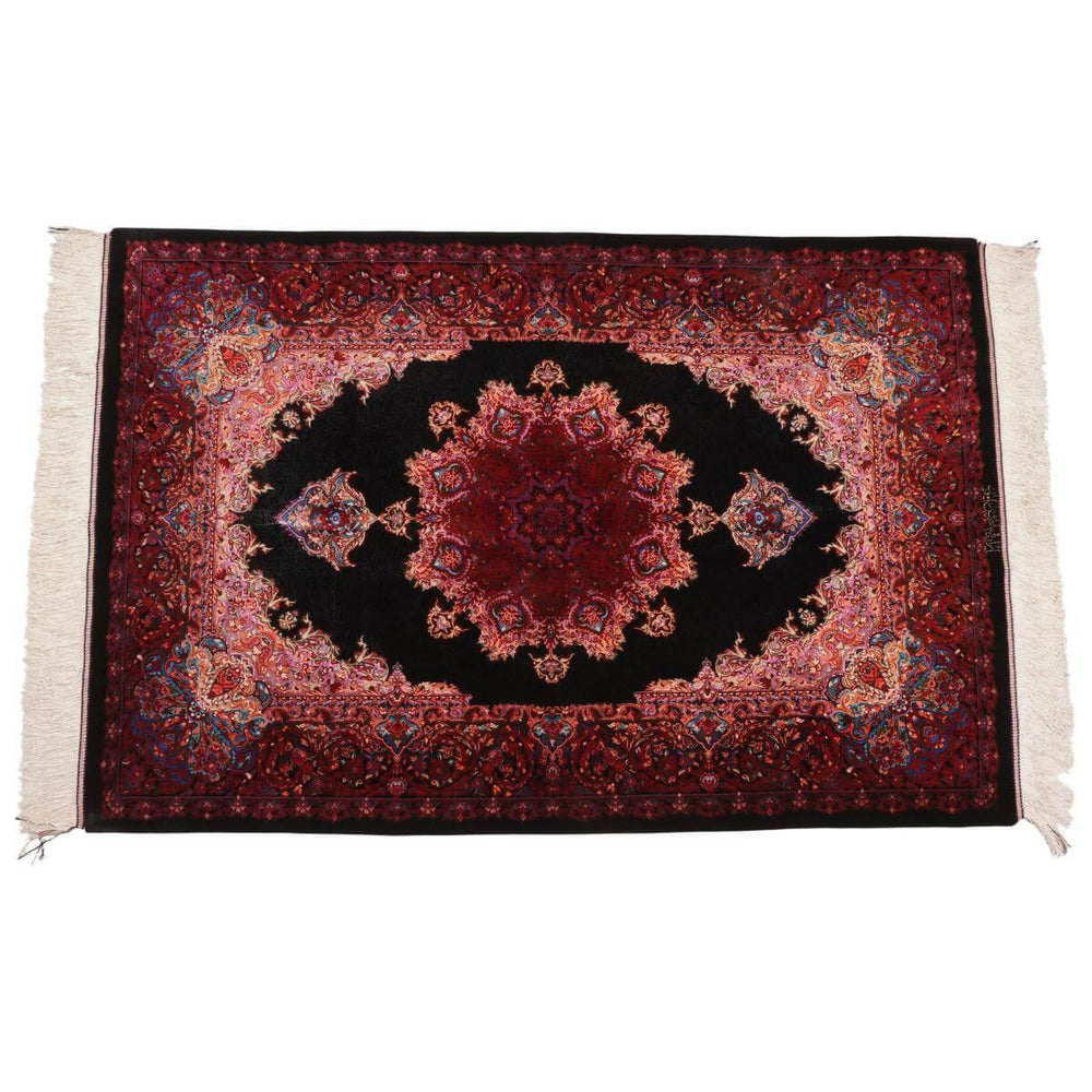 デザインの魅力:漆黒のフィールドに大きなメダリオンが浮かび、四隅の飾りが呼応。深い赤の縁が奥行きをつくり、空間をきりっと整えます。