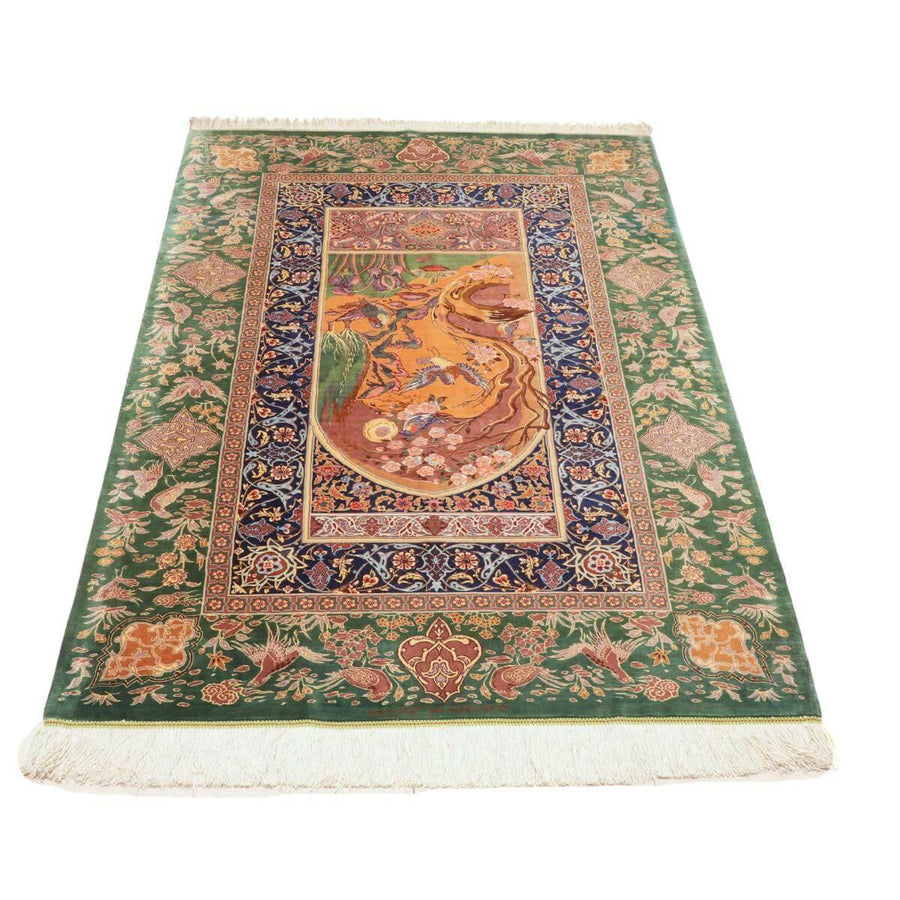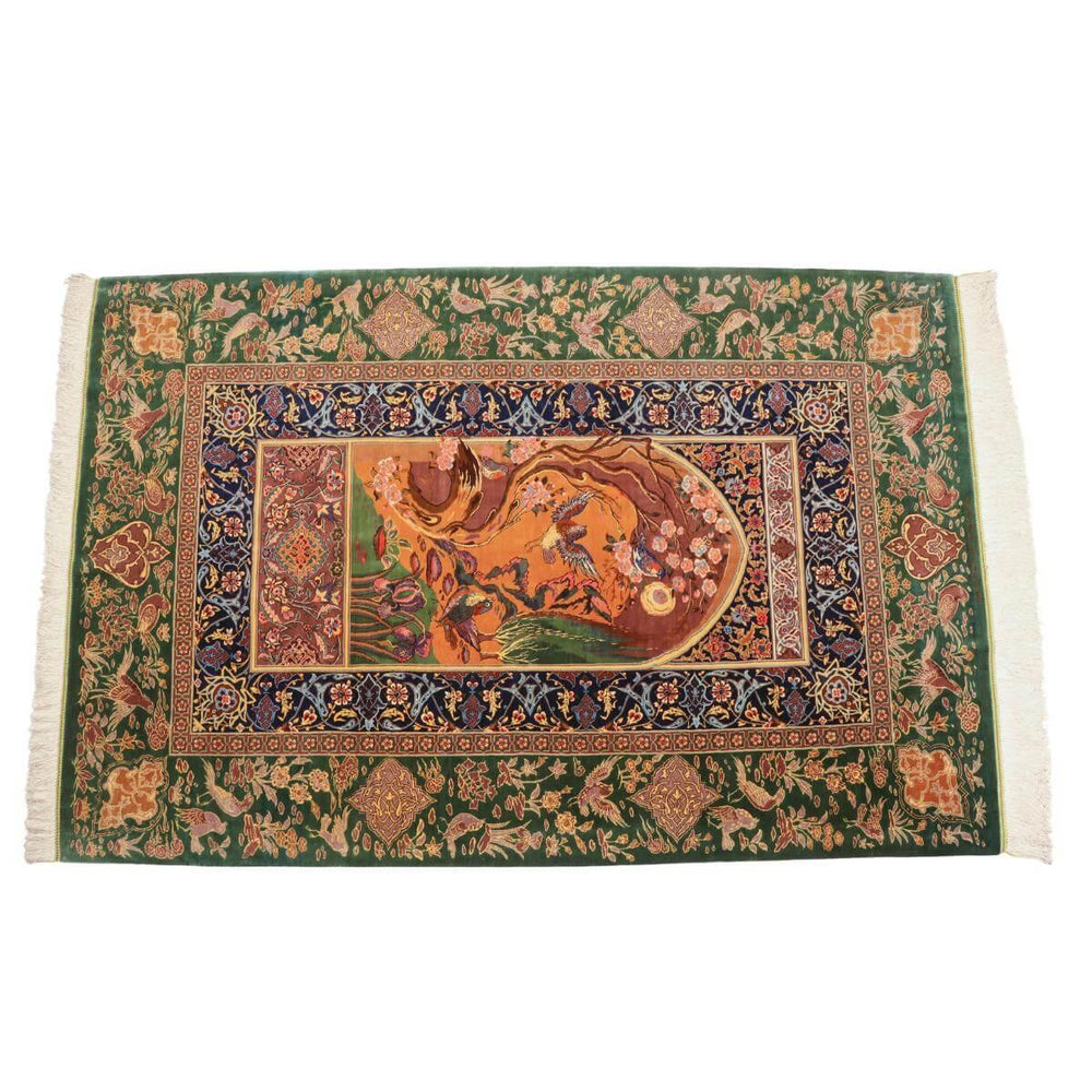 デザインの魅力:中央の額装された絵柄に鳥や樹木が生き生きと描かれ、紺の帯と緑の外枠が品よく囲います。敷くだけで絵画のような趣に。