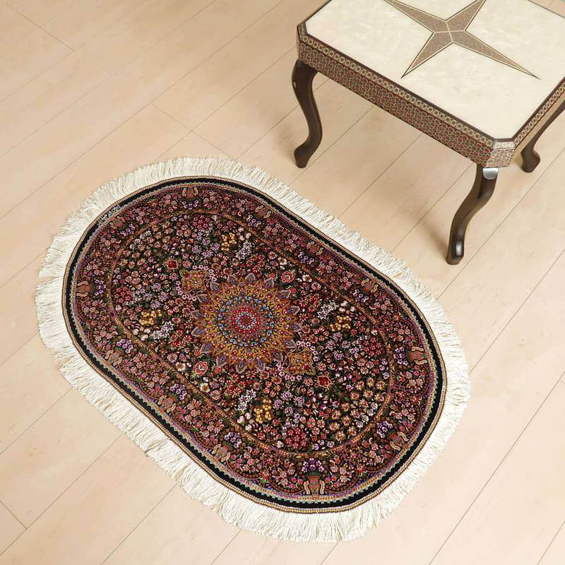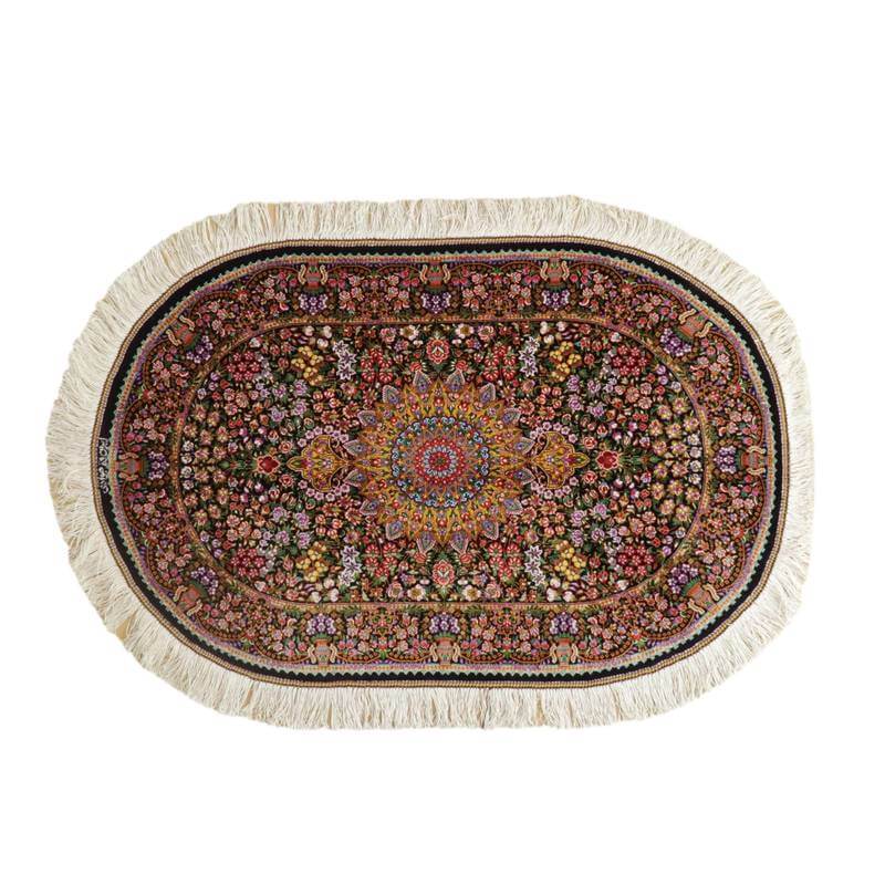 色とりどりの小さな花でぎっしり覆われた満開のガーデンをイメージした華やかな花模様。植物の持つやさしい雰囲気は、部屋にあると見るたびにほっと癒されます。背景は濃い茶色になります。曲線的な玄関によく馴染む、整ったきれいなラインの希少な楕円型です。「イラン ゴム ジャワディ」のサイン入り。