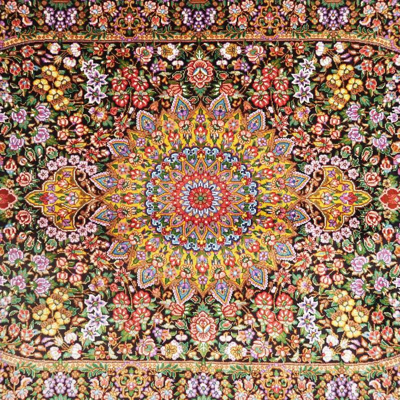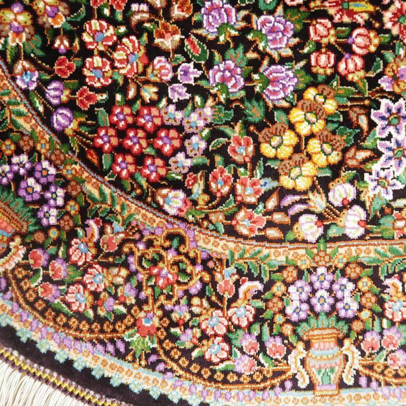 驚くような細かな織り目とビロードのような生地、肌に吸い付くようなシルクの艶やかな光沢感が豪華絢爛。まさに、「The ペルシャ絨毯」と言うべき最高峰のペルシャ絨毯は、もはや工芸品ではなく美術品としての価値となります。シルクの絨毯は毛足の光沢が見る向きによってまったく趣の異なる色合いになりますので、敷く際は向きを調整していただくとよいです。