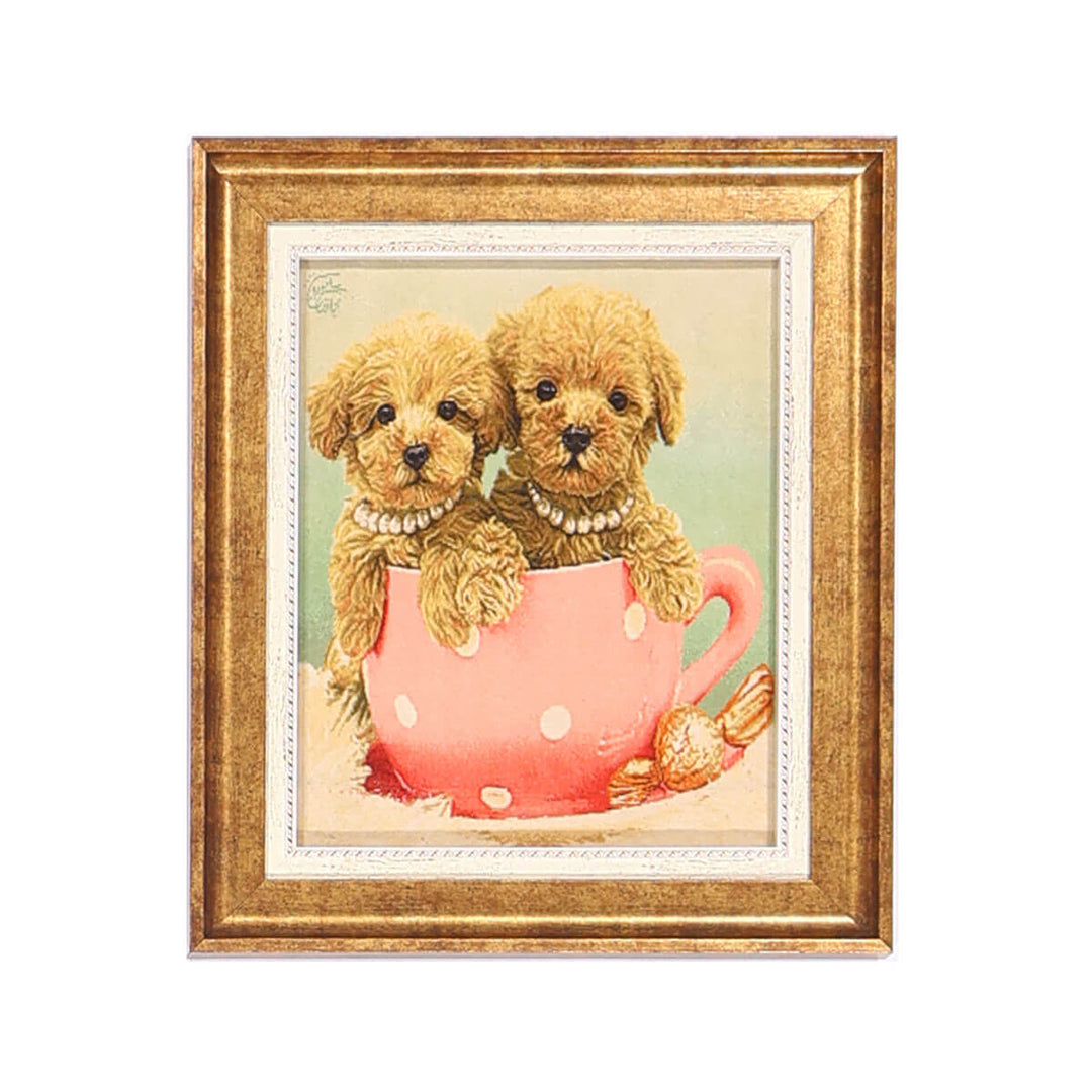 ピンクの水玉カップにちょこんと入った2匹の子犬。ふわふわの毛並みやつぶらな瞳まで繊細に表現され、見る人の心を和ませます。