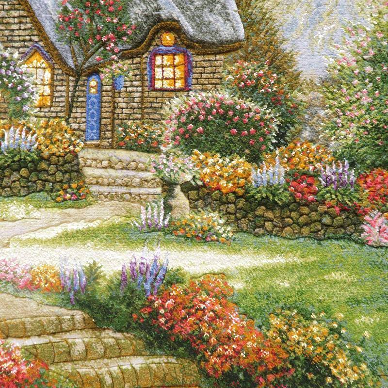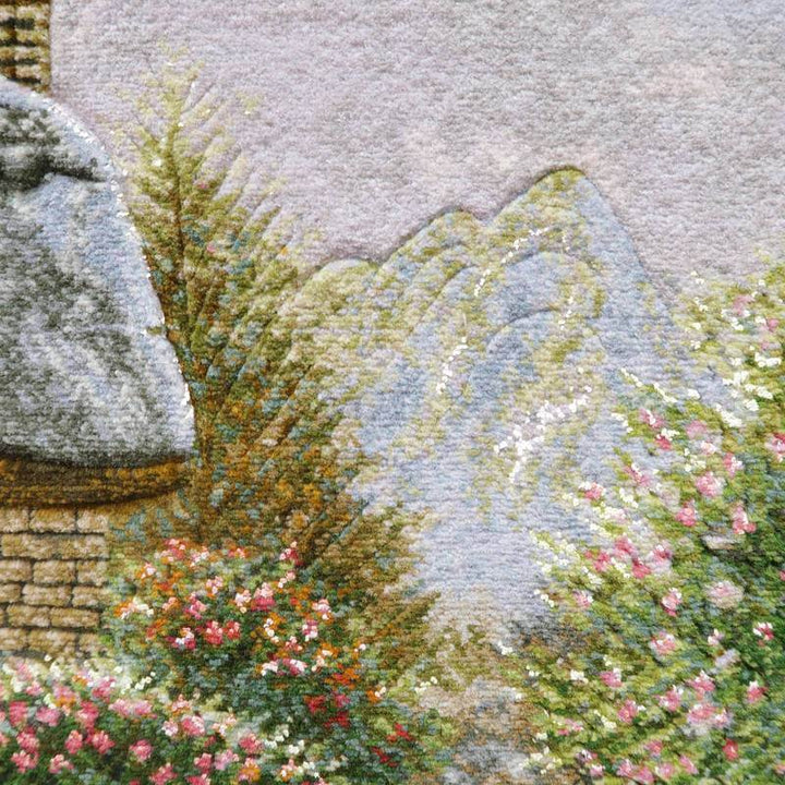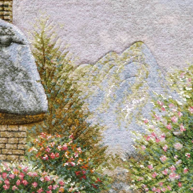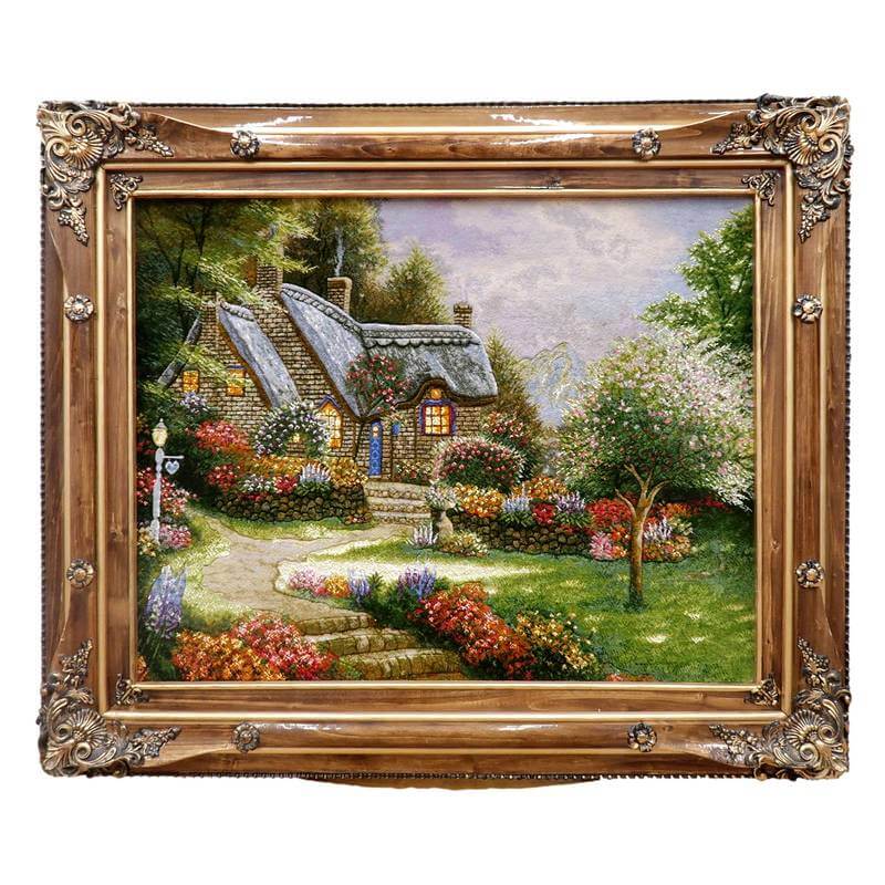 満開の花が咲く庭のある家の風景を描いています。110色にもおよぶ色数のウールとシルクを使用した色とりどりの花と緑、また、屋根、壁のレンガ、石垣などの様子は、高低をつけた職人のカッティング技術を駆使して、細かくリアルに表現され、その質感は絵画を超える美しさです。感性を刺激し、インテリアの価値を高めてくれるアートとしての作品を飾ることは、心を豊かにするためだけでなく、来客とのコミュニケーションツールとして特に海外で大変人気があります。また、こちらの額装は、中の絨毯をより引き立たせるため、職人による手彫りの木製額縁にこだわりました。