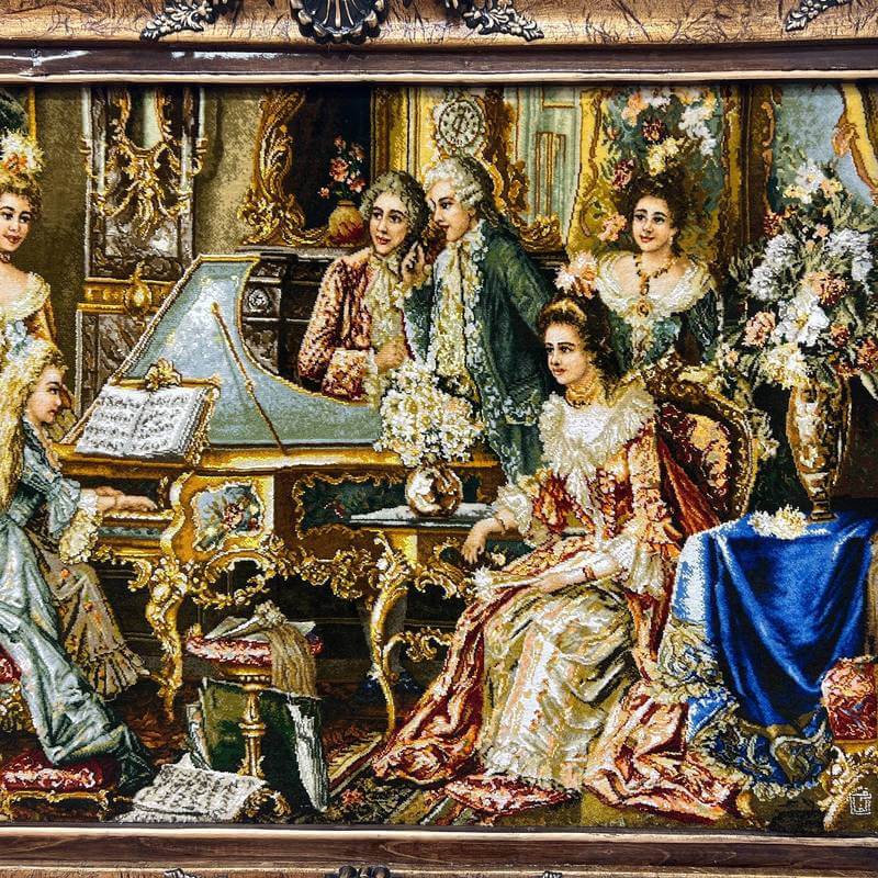 中世ヨーロッパの上流家庭。女の子のピアノの演奏を熱心に聞く大人たちの様子を丁寧に描いています。一番難しいと言われる人物の表情が美しく、繊細な調度品とともに優美に描かれています。80色にもおよぶ色数のウールとシルクを使用して、細かくリアルに表現され、その質感は絵画を超える美しさです。感性を刺激し、インテリアの価値を高めてくれるアートとしての作品を飾ることは、心を豊かにするためだけでなく、来客とのコミュニケーションツールとして特に海外で大変人気があります。また、こちらの額装は、中の絨毯をより引き立たせるため、職人による手彫りの木製額縁にこだわりました。