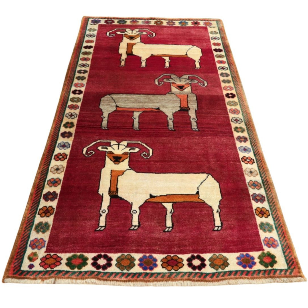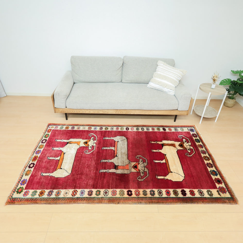 やや渋みのかかった落ち着きのある色合いに、動物モチーフが並びます。色の取り合わせとカシュガイの伝統柄が、レトロな雰囲気。たいへん魅力的で味わいあるカシュガイの少し古い年代の品。家庭用として作られた、本来の野性味溢れるこのようなトラディショナル・ギャッベは、特に、類似した品がめったになく、「世界に一枚」というユニーク性とその年代ならではの物という希少価値が高い品です。厚みは14ミリ位、やんわりと沈み込む踏み心地で、ツヤめく滑らかなウール素材、目の細かな丁寧なつくりです。
