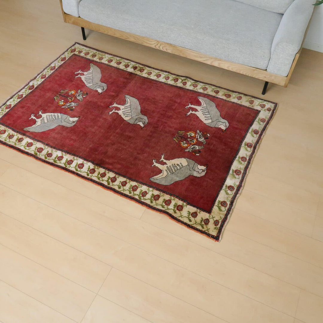 ベーシックなギャッベに比べると細めの糸を使用しており、ハリ感のある踏み心地が心地の良い、織りの詰まった作りです。コンディションの良い品を厳選しておりますが、年代なりの魅力としての擦れたような箇所、形の歪みやにじみ等がみられる部分は敢えて持たせるセレクトとしております、新品にはない味わいとしてご鑑賞ください。メンテナンスクリーニングは現地と自社で二重に施しており、清潔感をもって使えます。
