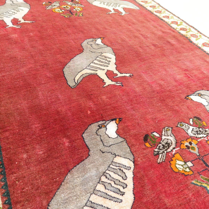 落ち着いた明るめの色合い。5匹の薄グレーの鳥はころんと丸みのある形で、かわいらしい印象です。織る人それぞれの個性が光る伝統柄が、たいへん魅力的で味わいあるカシュガイ族の少し古い年代のギャッベです。家庭用として作られたギャッベ本来の野性味溢れるこのようなトラディショナル・ギャッベは、特に、類似した品がめったになく、「世界に一枚」というユニーク性とその年代ならではの物という希少価値が高い品です。厚みは15ミリ位、さらりとした毛足、カシュクリのような大変目の細かな織りです。生地に使用には支障がない程度の細かなオウトツがありますが、年代物の風合いとして予めご了承ください。