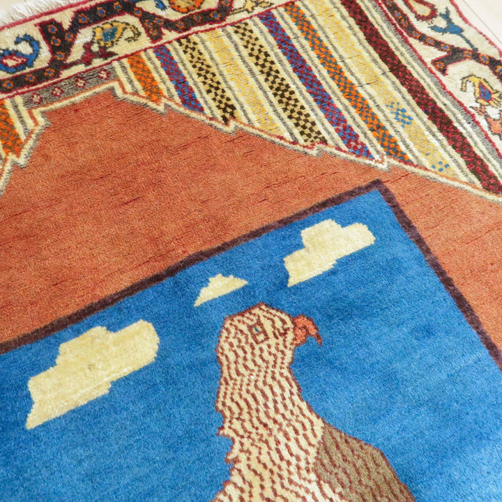 枯れたレンガ色の軽さのある色合い。中心に勇ましい鳥を絵を飾るように大きく描いたインパクトのあるデザインは、日常の風景からのインスピレーション。家庭用として作られたギャッベ本来の野性味溢れるこのようなトラディショナル・ギャッベは、特に、類似した品がめったになく、「世界に一枚」というユニーク性とその年代ならではの物という希少価値が高い品です。厚みは16、17ミリ位、やんわり沈み込む踏み心地、織りが細かく、光沢感の大きな滑らかなウール素材。