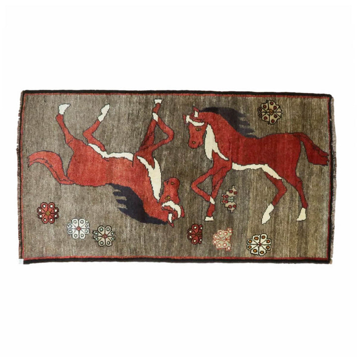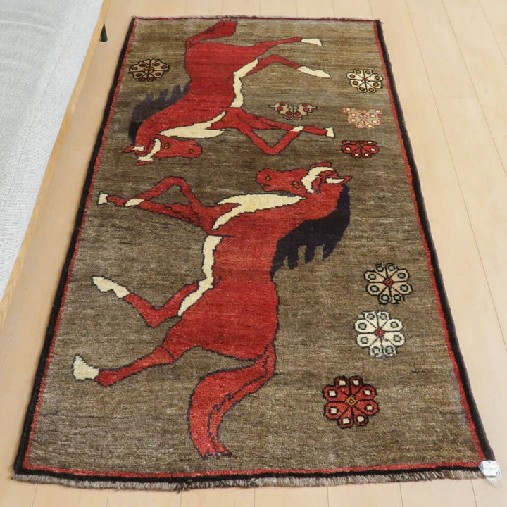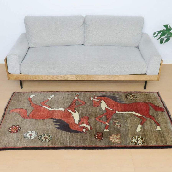 ブラウンの背景にエンジ色の大きな馬が印象的。家庭用として作られたギャッベ本来の野性味溢れるこのようなトラディショナル・ギャッベは、特に、類似した品がめったになく、「世界に一枚」というユニーク性とその年代ならではの物という希少価値が高い品です。厚みは15ミリ弱位、オールドらしく、てろんとしなやかになった生地感、やわらかなウール素材。