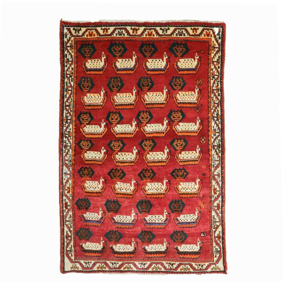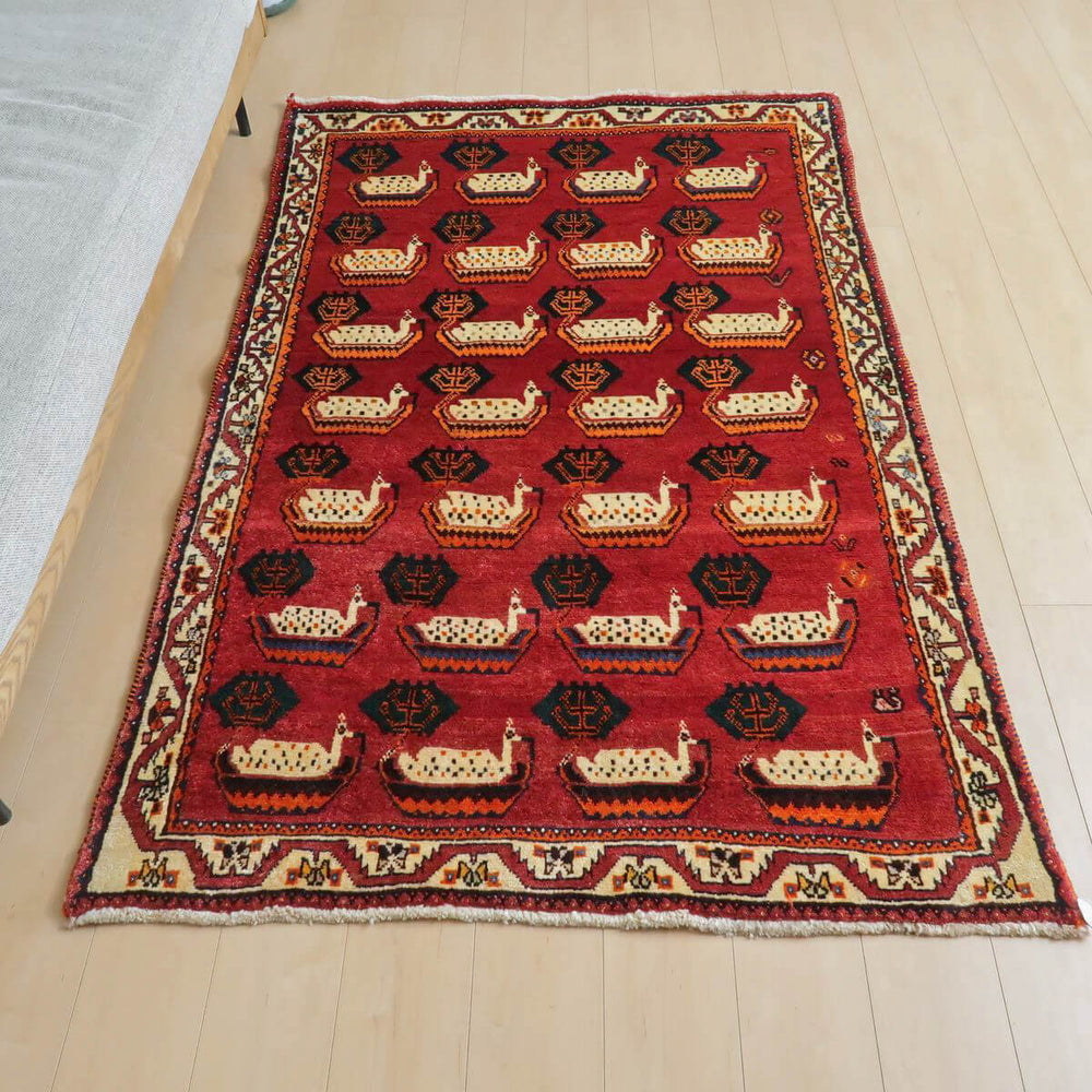 やや渋みのかかった落ち着きのある色合いに、個性のあるモチーフが並びます。色の取り合わせとカシュガイの伝統柄が、レトロな雰囲気。たいへん魅力的で味わいあるカシュガイの少し古い年代の品。家庭用として作られた、本来の野性味溢れるこのようなトラディショナル・ギャッベは、特に、類似した品がめったになく、「世界に一枚」というユニーク性とその年代ならではの物という希少価値が高い品です。厚みは17ミリ位、やんわりと沈み込む踏み心地で、ツヤめく滑らかなウール素材、目の細かな丁寧なつくりです。