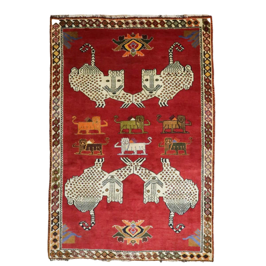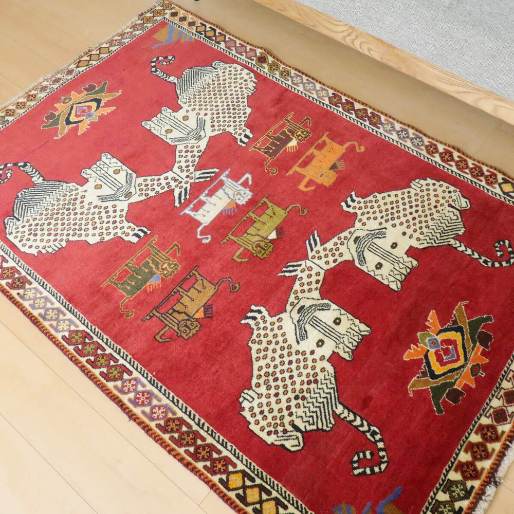 思わず笑みがこぼれるようなユニークな動物の表情が印象的。年代を重ねた色合いとカシュガイの伝統柄が、たいへん魅力的で味わいあるカシュガイ族の少し古い年代のギャッベです。家庭用として作られたギャッベ本来の野性味溢れるこのようなトラディショナル・ギャッベは、特に、類似した品がめったになく、「世界に一枚」というユニーク性とその年代ならではという希少価値が高い品です。厚みは13ミリ程度、ツヤのある滑らかなウール素材。