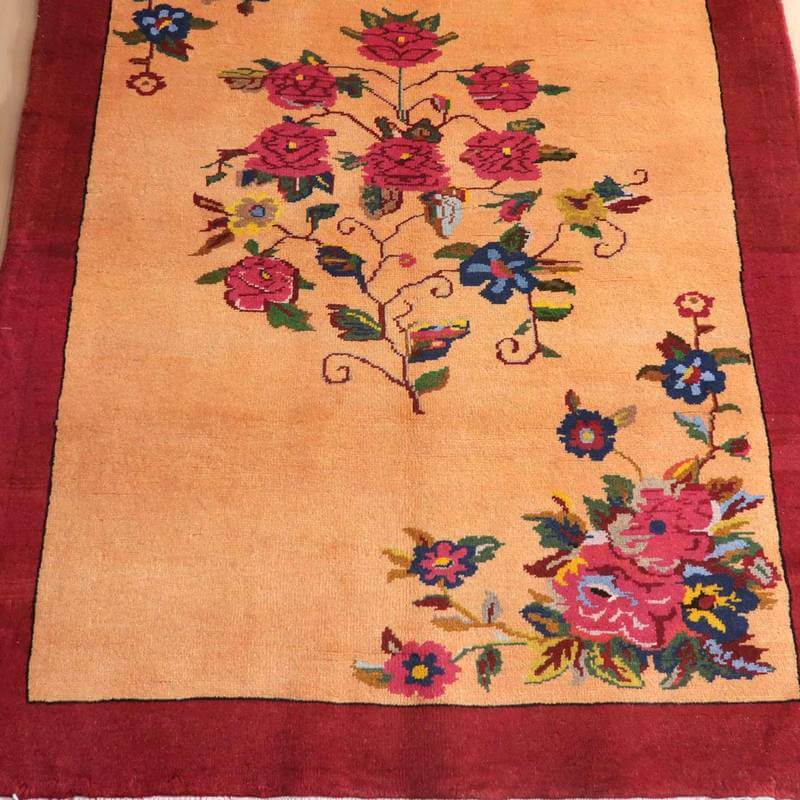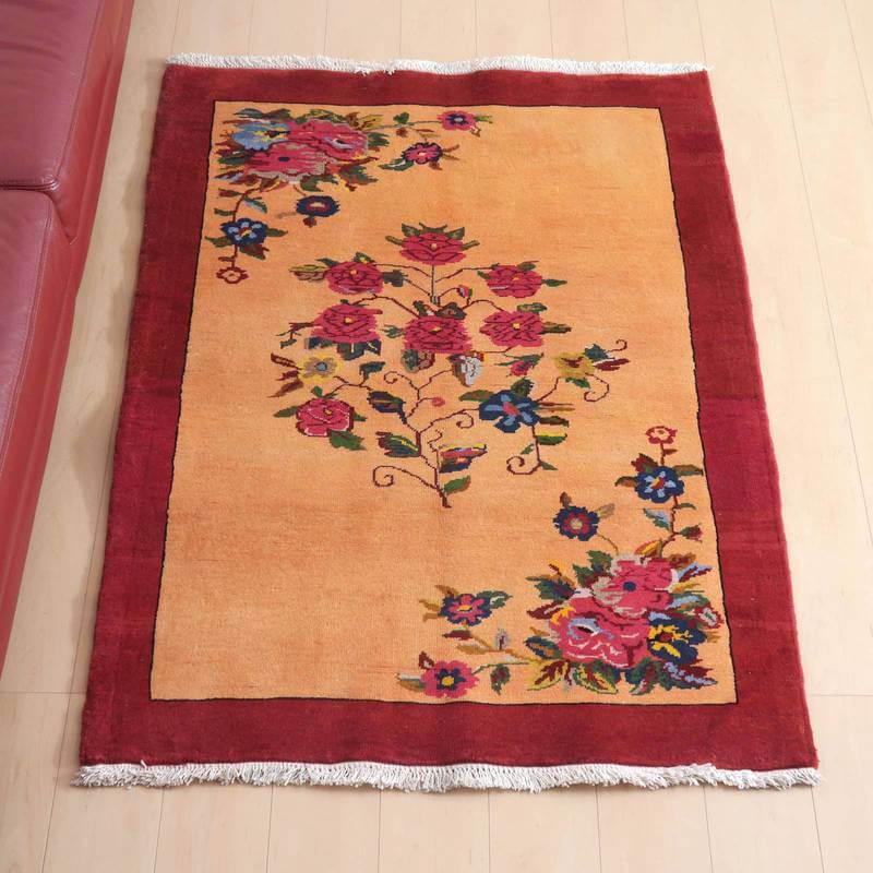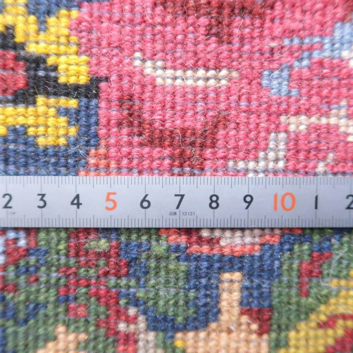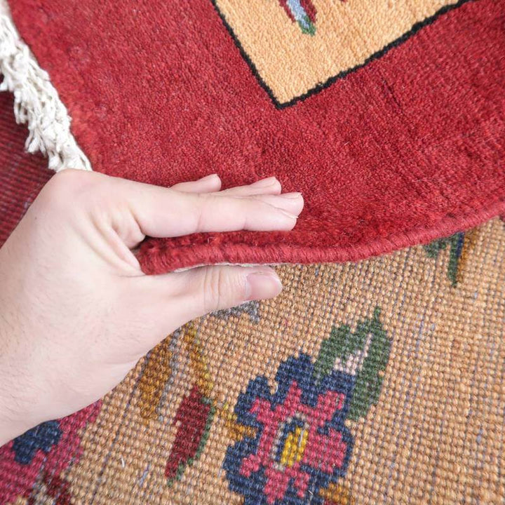 家庭の中で、母から娘に受け継がれて織られる昔ながらの家庭織りの絨毯です。かたく目の詰まった丈夫な作りで、早く仕上げる為ゆるく粗く織られる商用生産の絨毯には無い、誠実さと愛着が感じられる手仕事の味わい深さがあります。長い歴史に裏打ちされた確かなクォリティは、本物志向の方、違いの分かる方にこそ愛されています。イラン南部、シラーズ地方ならではの色彩豊かな色使いの明るいデザインです。