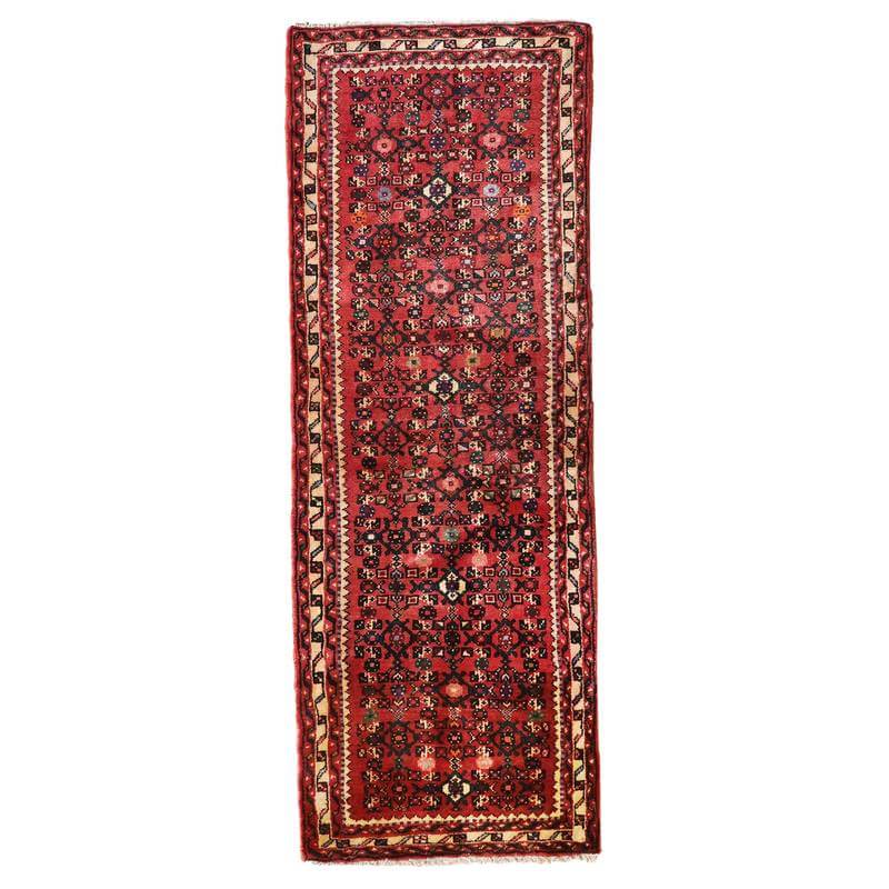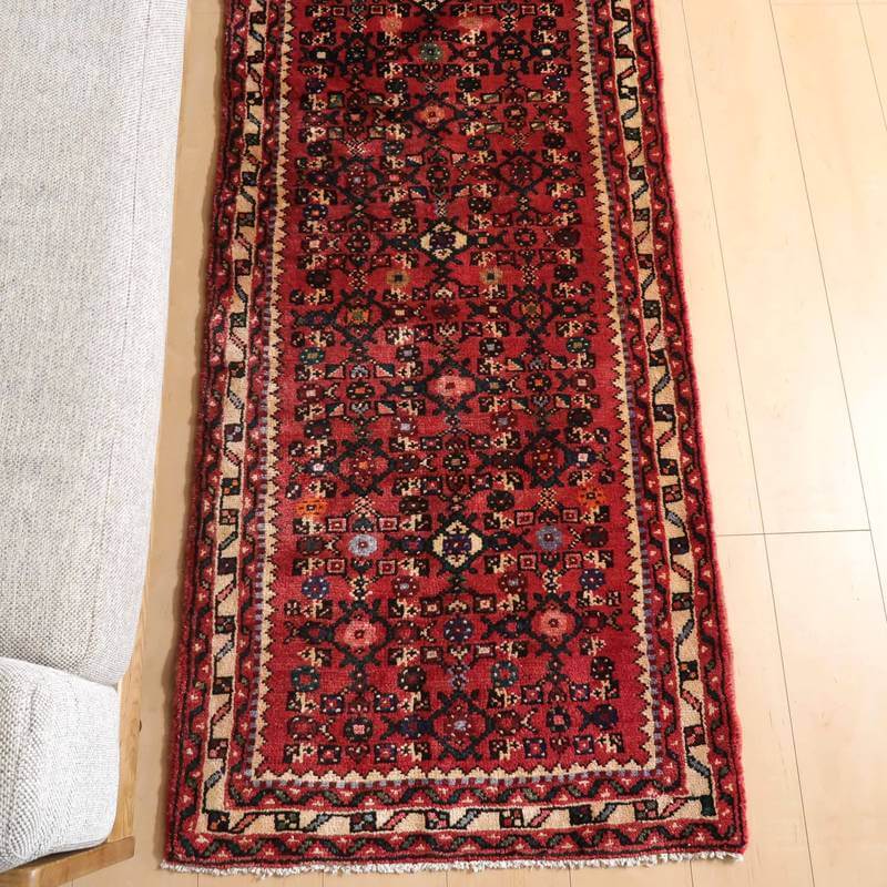 薄く褪せた赤茶がよい雰囲気、緑のひし柄に細かな文様が規則的に並ぶデザイン。花や魚や人のモチーフ見ていて楽しさを感じます。和洋問わずに合わせやすく、アレンジ次第でモダンにもなる品です。柔らかな手触りでこなれた生地感です。産地はイラン中西部ハマダン州にあります。