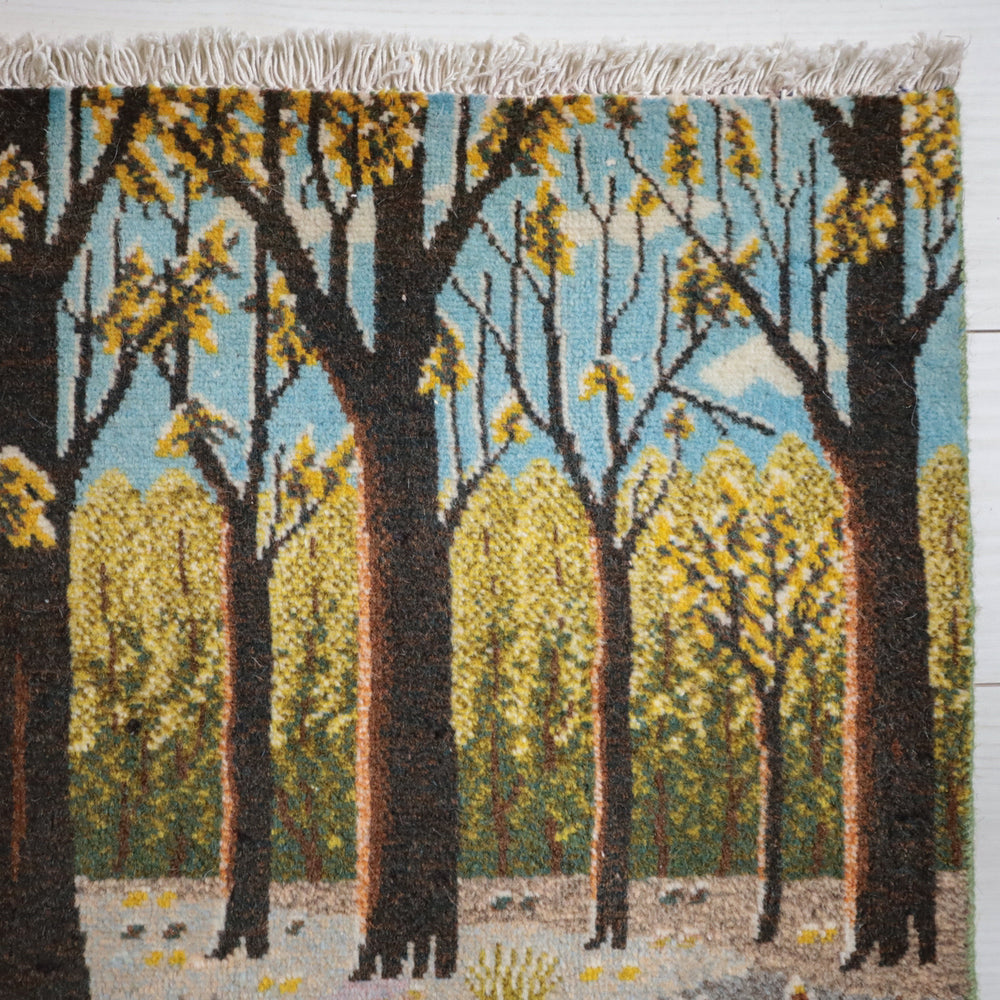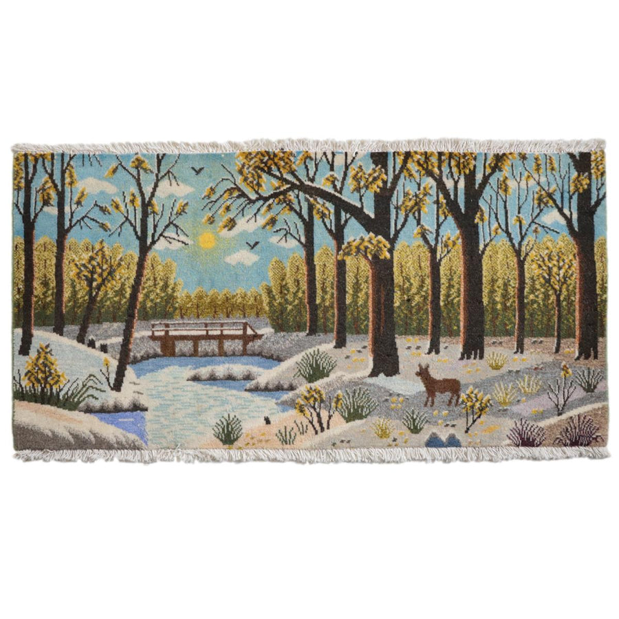 身の回りの自然の風景をバランスの良い絵にしたピクチャー絨毯です。野山の様子や動物をじっくり見てみるとたいへん丁寧に表現されていて、見るたび楽しい温かみある絨毯です。柔らかな手触りのウールでしっとりと心地の良い踏み心地。壁掛けとしてタペストリー加工も対応できます。