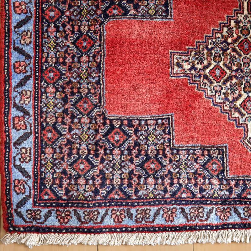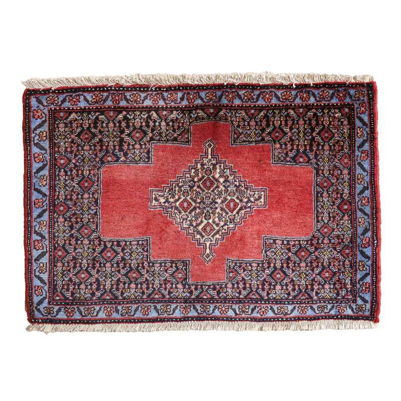 真ん中に大きなひし形模様を配したサナンダジ地方特有の文様デザイン。茶交じりの赤、紺、ブルーを基調とした落ち着いた雰囲気、細い糸を使用した織りの詰まった作りで、しなやかな生地感の滑らかな手触りです。