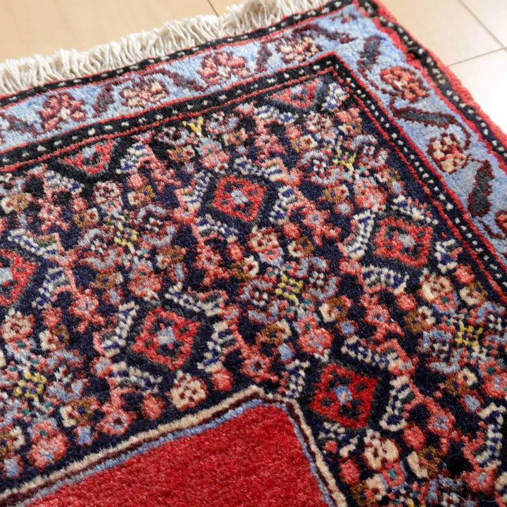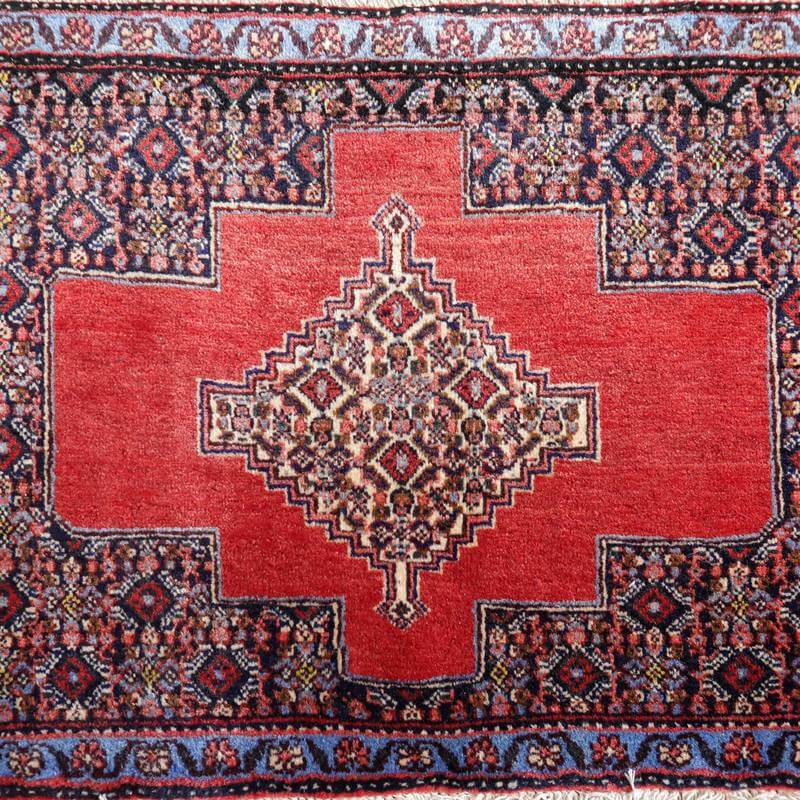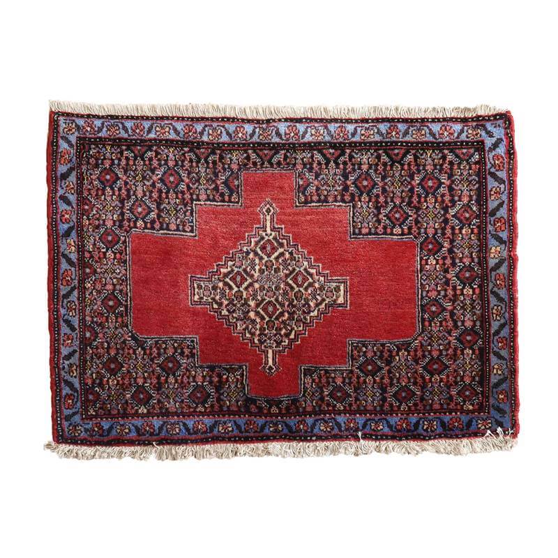 真ん中に大きなひし形模様を配したサナンダジ地方特有の文様デザイン。茶交じりの赤、紺、ブルーを基調とした落ち着いた雰囲気、細い糸を使用した織りの詰まった作りで、しなやかな生地感の滑らかな手触りです。