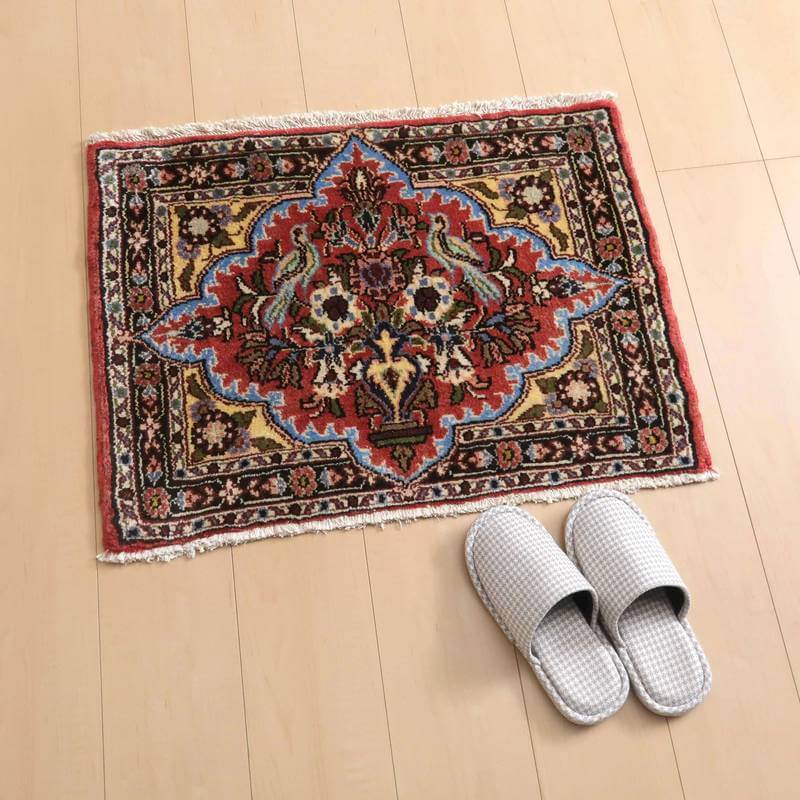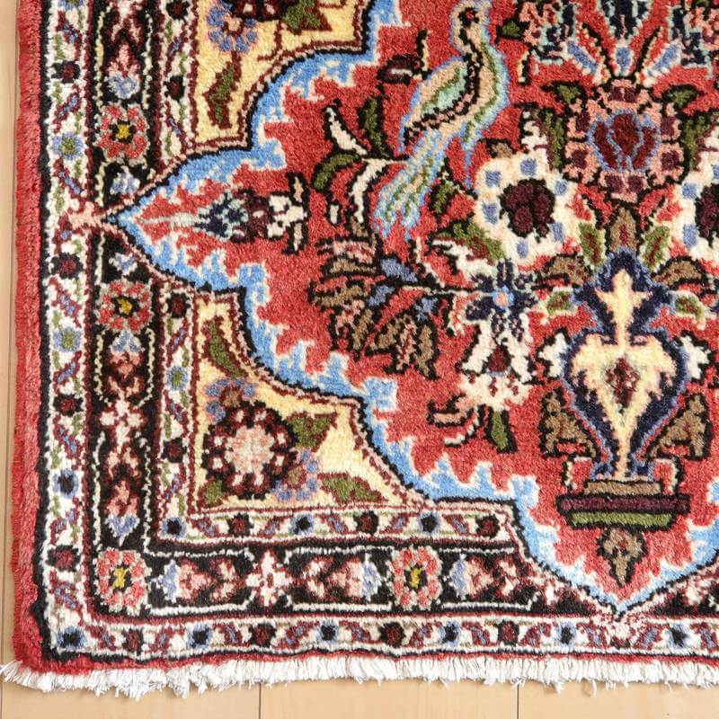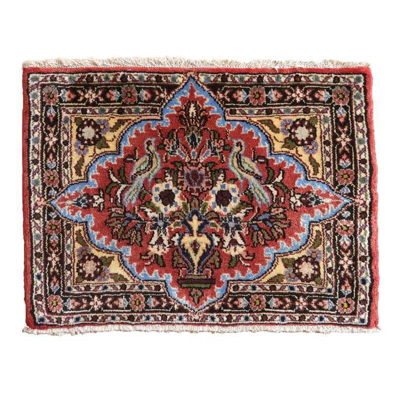 外枠のボーダーに大きくかかっているダイヤの中に花瓶と鳥の柄の入った小さいながらも美しい存在感をもつバランス良いデザイン。柔らかくあせた色アースカラーが落ち着いた美しい色、コンディション良好な柔らかな手触りの毛足です。