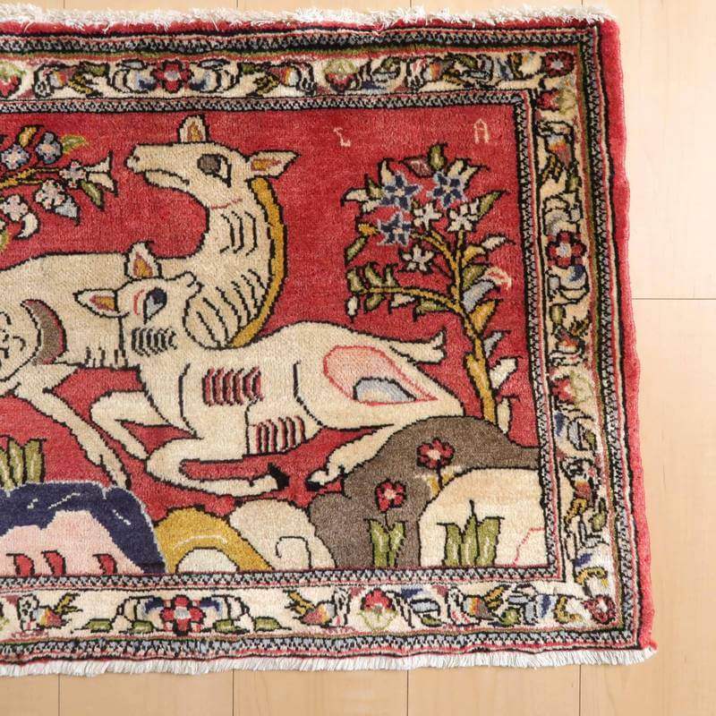 織り手が身近な人を動物に投影して織ったものが、しばしば家庭織りの絨毯の中に見られます。ストーリーは作り手のみ知るもの、私たちは想像をふくらませて眺めます。大きな瞳が可愛らしい表情。しなやかな生地感で滑らかな手触りです。