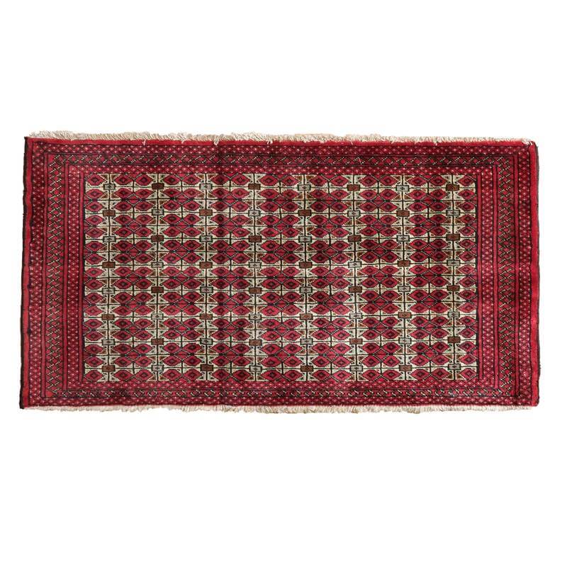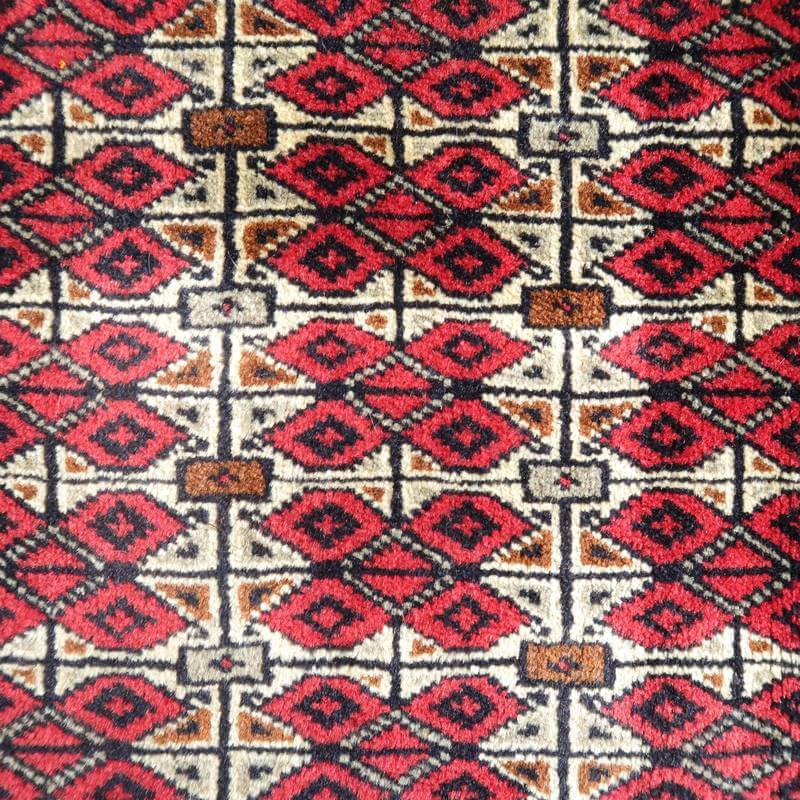 トルクメンの特徴は、ギュルと呼ばれる文様が整然と並んだパターン柄です。薄枯れた赤を基調に薄い青緑の色使いです。目の細かな薄めの生地でさらりと短い毛足です。トルクメン族は、主にトルクメニスタンからイラン北東部にかけての周辺民族で、中央アジアがロシア領になって以後イスラム教徒のトルクメン族はイラン、アフガニスタン北部に多く移り住むようになりました。パキスタン段通などトルクメン柄を模して作るものも多数あります。
