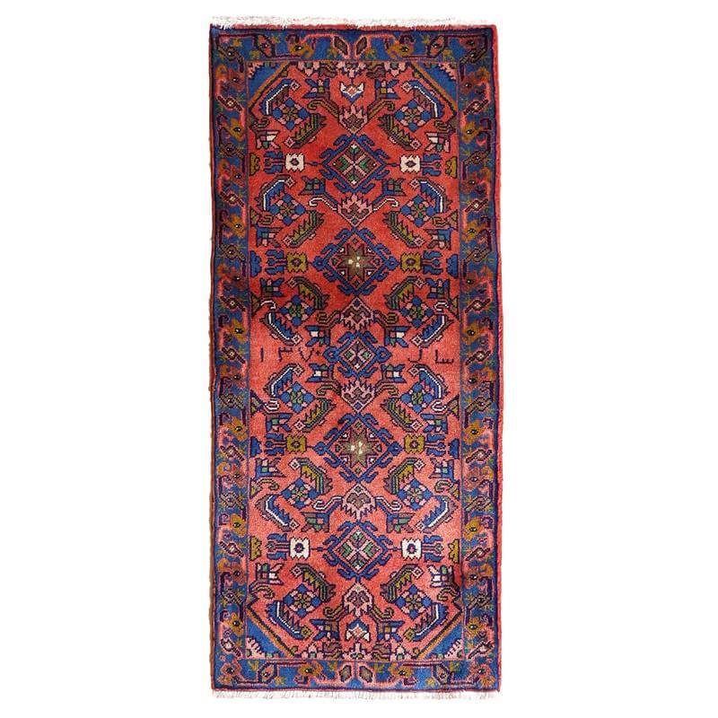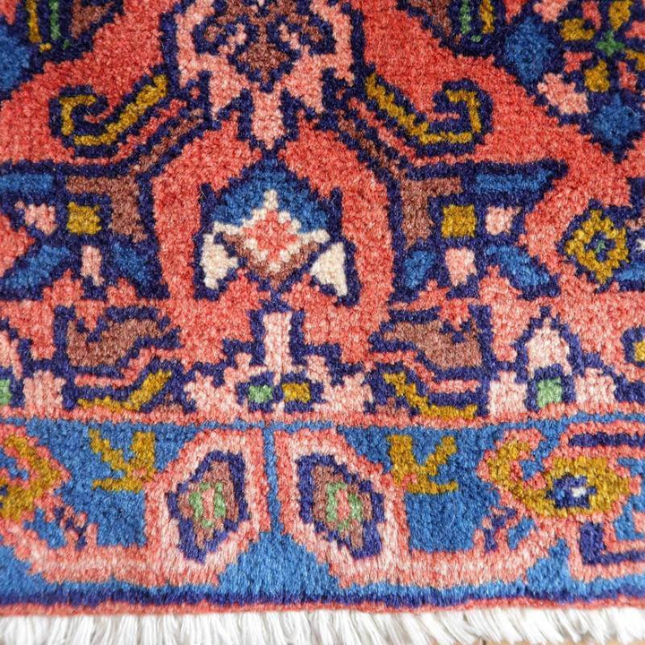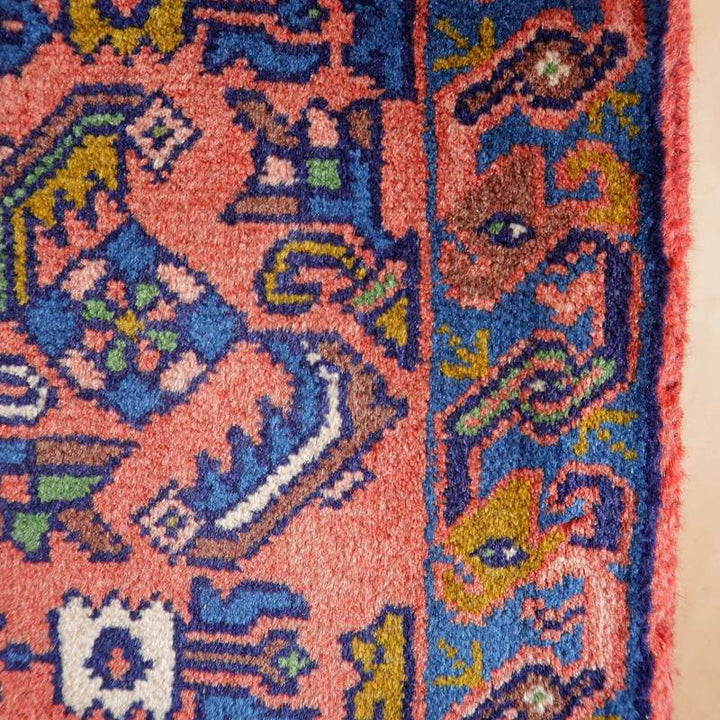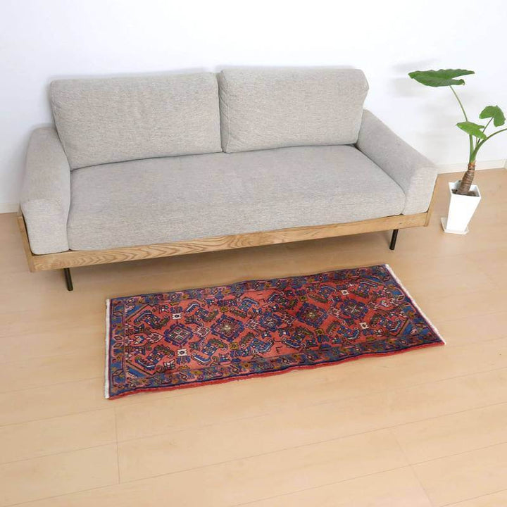 イラン南西部アフワーズに近い小さな村で家庭織りとして織られた普段使いの絨毯です。魔よけの意味を持つカギ足のついたひし形の文様がシンメトリーに並んだバランスの良いデザインです。真ん中にペルシャ語で1370年と入っていて何の記念の作なのかと想像がふくらみます。褪せ感も雰囲気が良いので、和洋問わずに合わせやすく、アレンジ次第でモダンにもなる品です。柔らかなウールです。