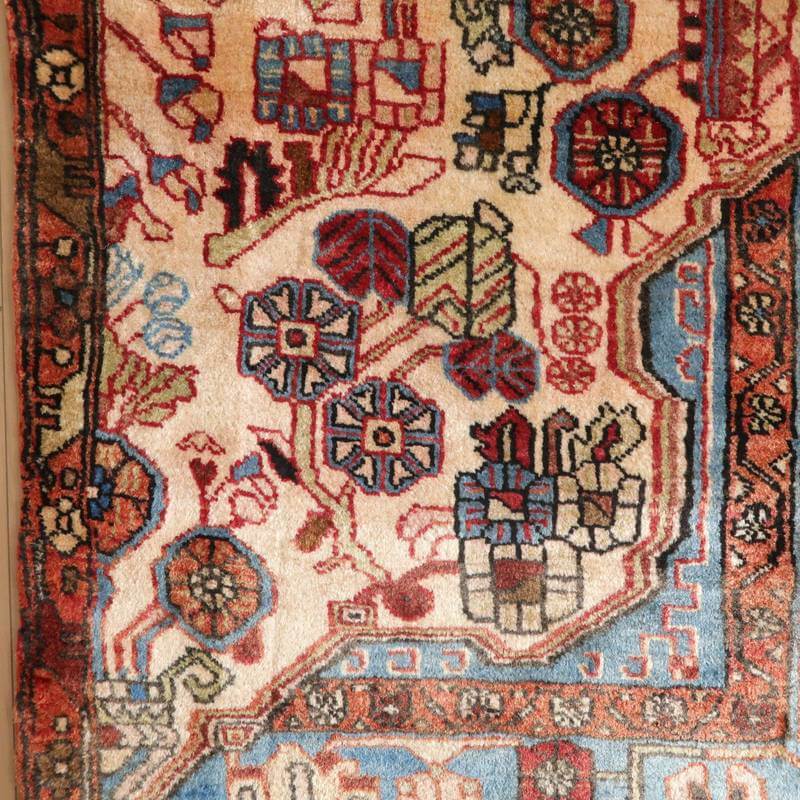 主だったカラーはアイボリー、シアンブルー、赤茶ですが、全体を茶渋色でコーティングしたような大変渋いカラーです。大きなものをカットしたかのような非対称なデザインが大変ユニークで味わいのある生命の木デザインです。ふっくら厚手でツヤのある生地です。踏むたびに、柔らかくしっとり気持ちの良いウールの感触を味わえる十分な素材品質で、日々の普段使いで快適さを実感いただける絨毯です。