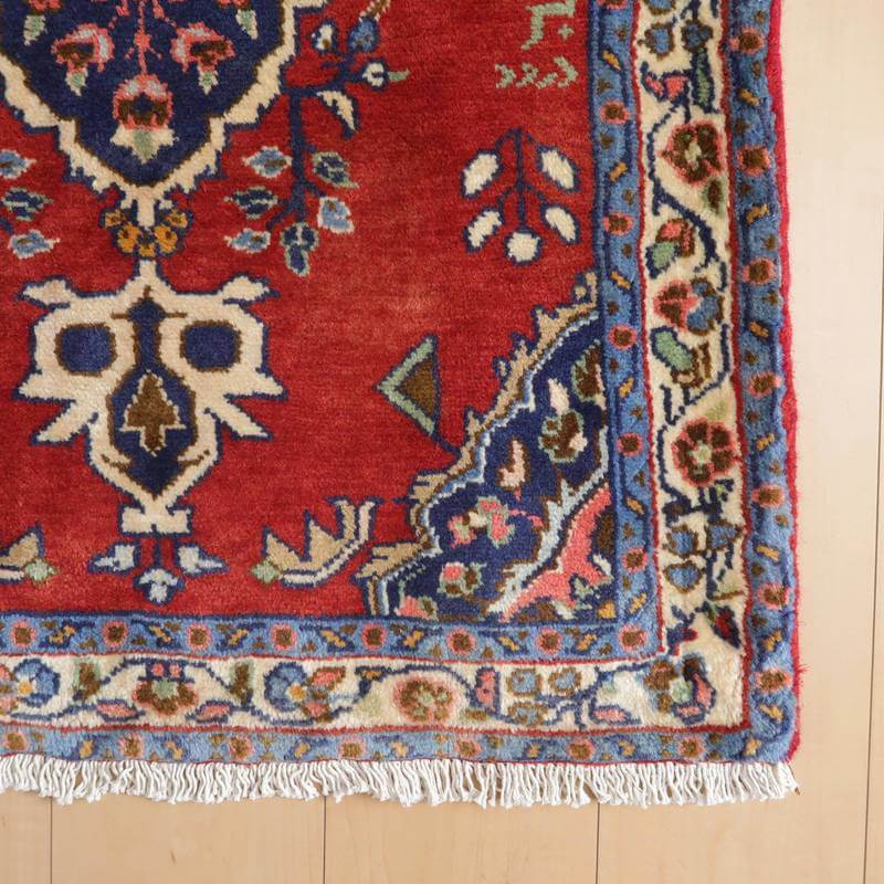 コンディションの良い品を厳選し、イラン式絨毯丸洗い洗浄を2回施した後メンテナンスをしていますが、年代物の商品には曲がりや摩耗、小さな補修やにじみがあるものもあり、商品の特性としております。汚れや破損のままのユーズド品ではございませんので新品同様の状態で安心してお使いいただけます。