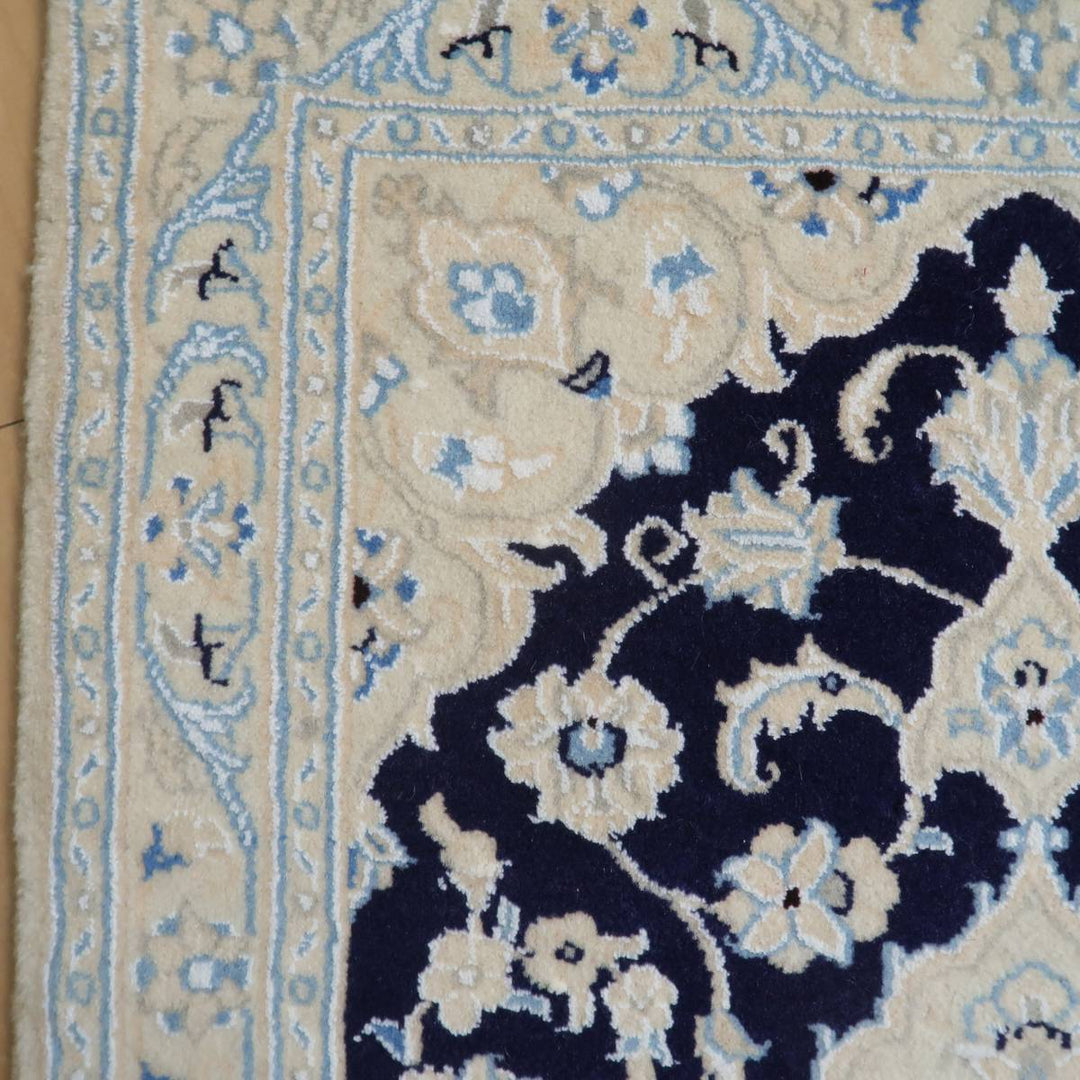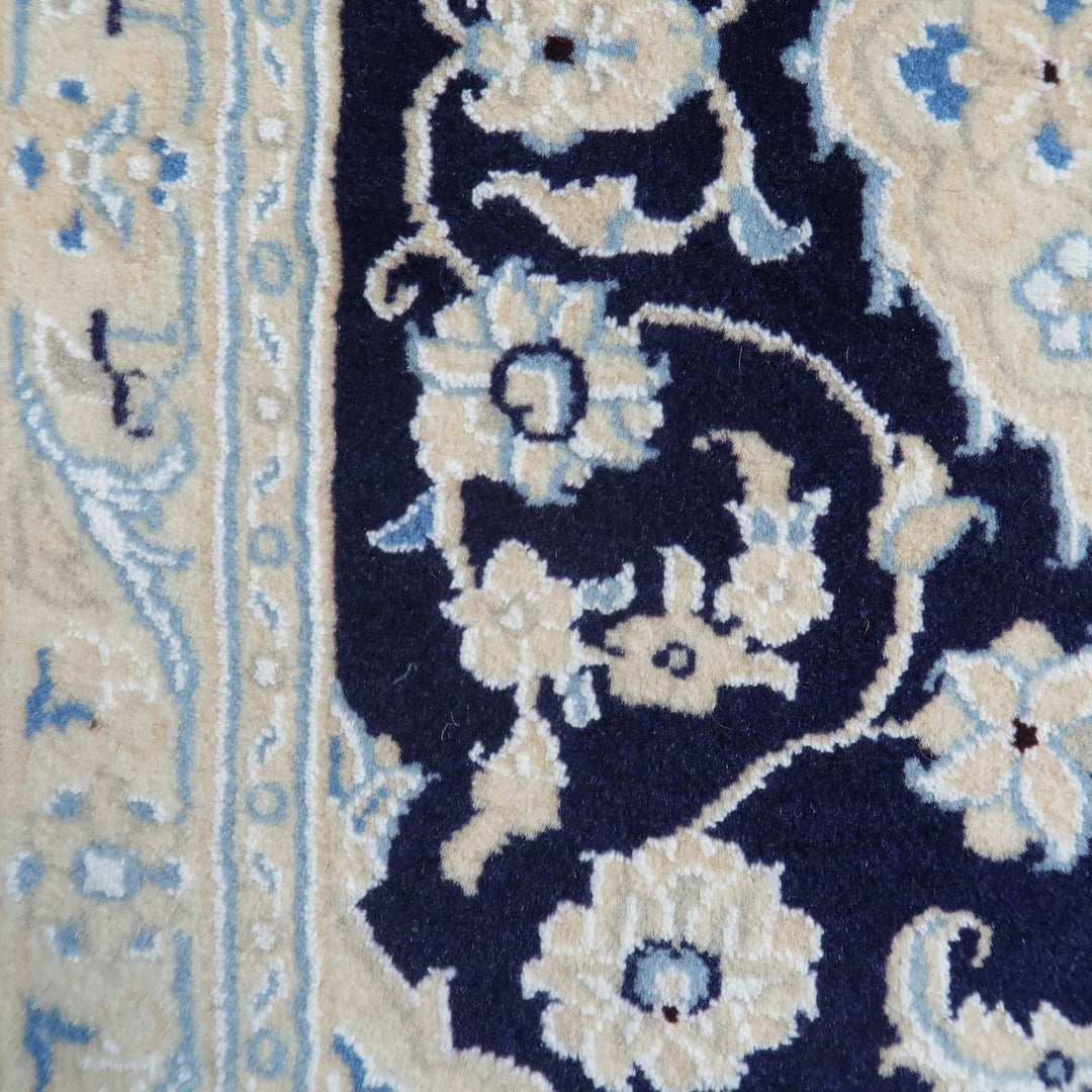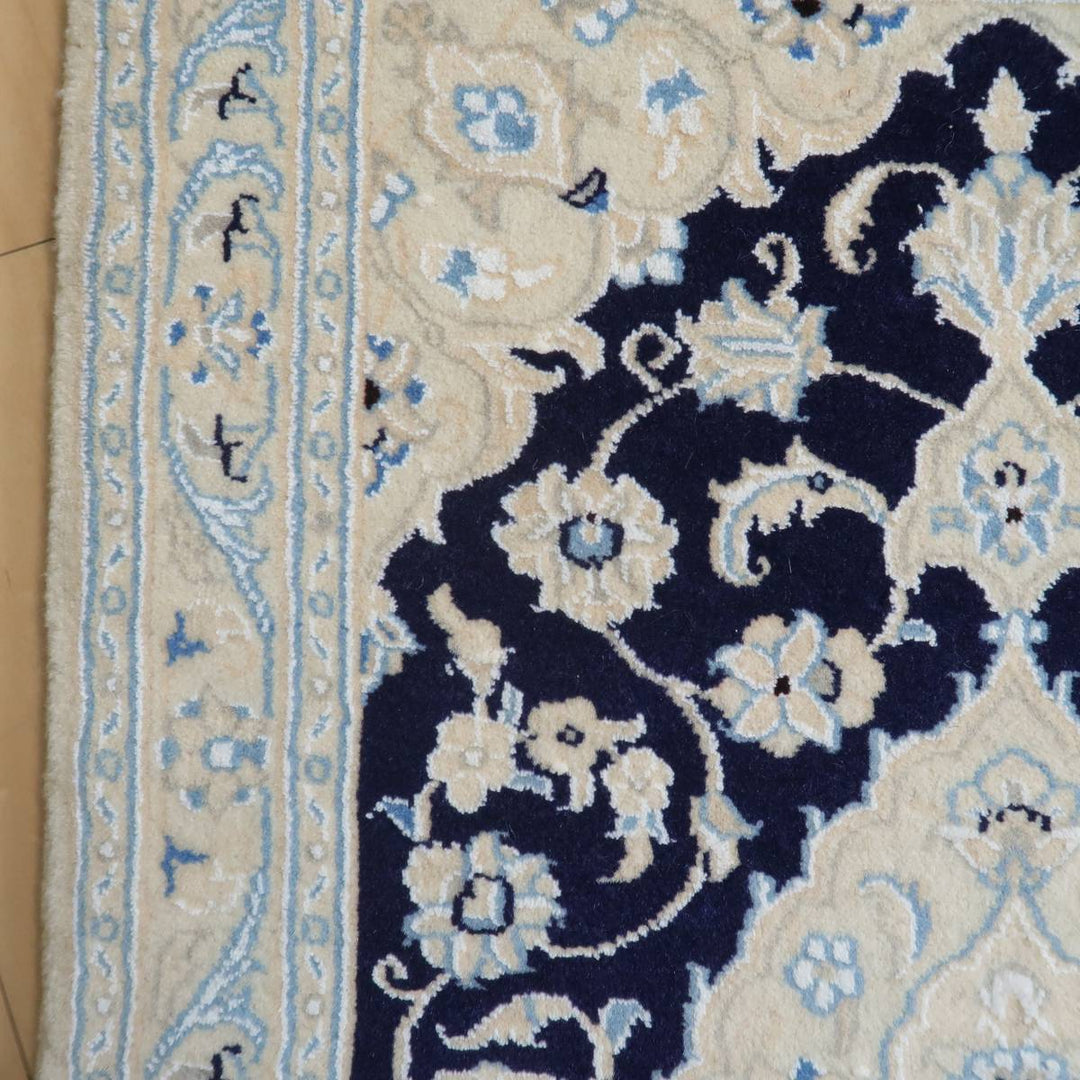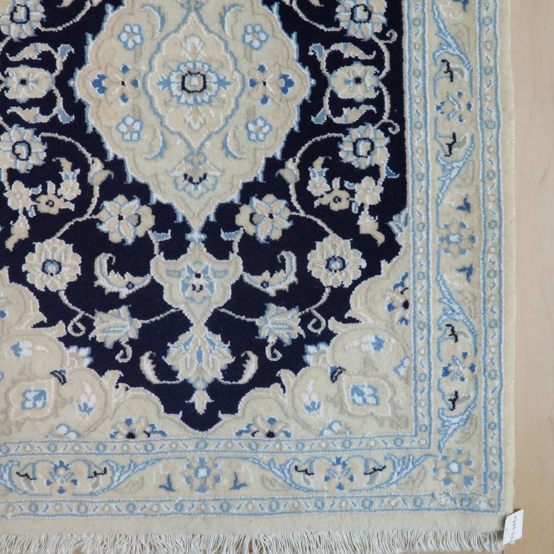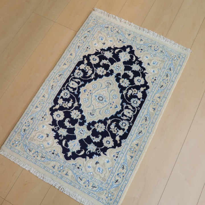 アイボリー×濃紺の爽やかな色合い。明るい白を基調にシンプルな色使いと安心感のある図柄で、親しみやすいデザインは、どこから見てもバランス良く見える王道のトランジ柄で、どのような場所、インテリアにもしっくりと馴染みます。程よくクッション性のある、ピンとしたハリのある毛足は、ふんわりした柔らかな手触りで、丁寧にきっちりと織られています。