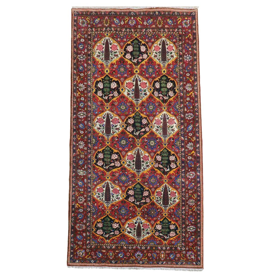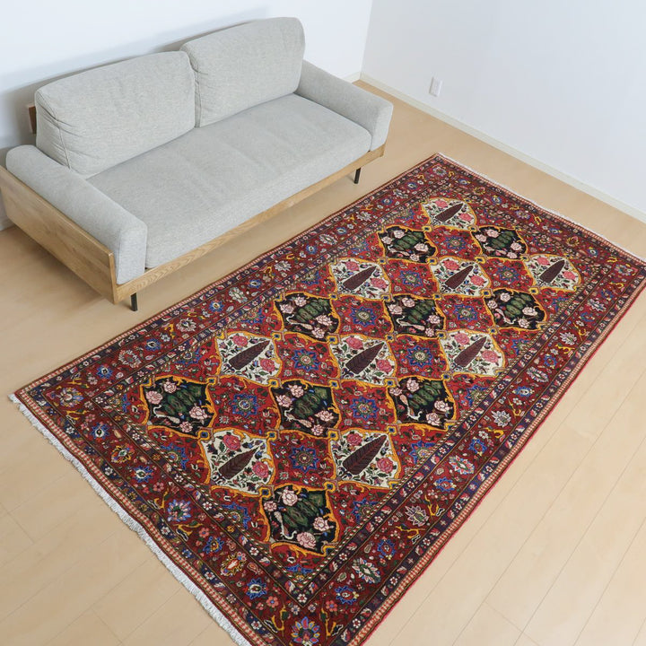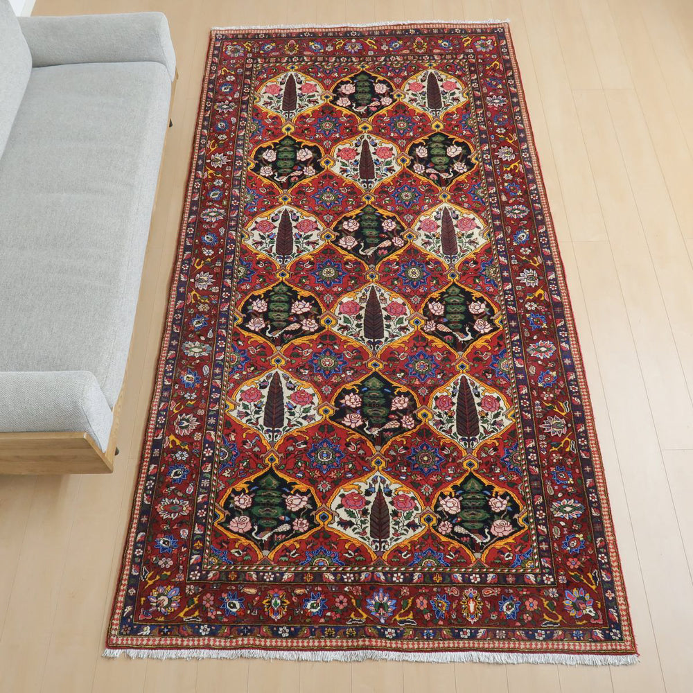 深い赤を基調にしたペルシャ絨毯です。カラフルな花や木のモチーフが美しく、お部屋にエレガントで華やかな雰囲気を感じさせる一枚です。イラン西南部ザクロス山脈に暮らすバクティアリ族のペルシャ絨毯です。