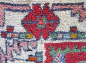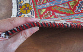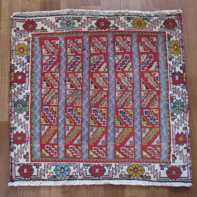 枯れた色合いとカシュガイの伝統柄が味わいあるアンティクオールドのカシュガイ絨毯。デザイン性と温かみのある素朴な雰囲気に気分がなごみます。カシュガイ絨毯の厚みは、だいたい10ミリ前後で、細手の糸のさらりとした毛足感。玄関や足元マットのほか、座布団や壁飾りとして、インテリア上級者に取り入れて頂きたいアイテムです。こちらは、丁寧な織りで、歪みが少しあります。
