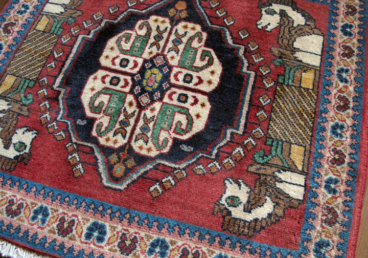 枯れた色合いとカシュガイの伝統柄が味わいあるアンティクオールドのカシュガイ絨毯。デザイン性と温かみのある素朴な雰囲気に気分がなごみます。カシュガイ絨毯の厚みは、だいたい10ミリ前後で、細手の糸のさらりとした毛足感。玄関や足元マットのほか、座布団や壁飾りとして、インテリア上級者に取り入れて頂きたいアイテムです。