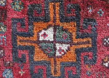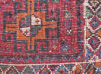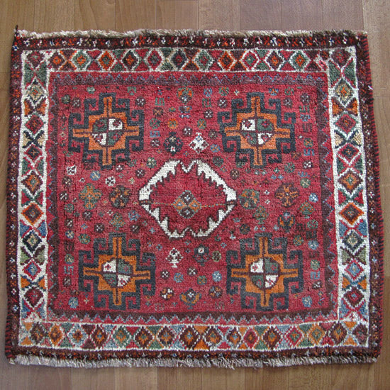枯れた色合いとカシュガイの伝統柄が味わいあるアンティクオールドのカシュガイ絨毯。デザイン性と温かみのある素朴な雰囲気に気分がなごみます。カシュガイ絨毯の厚みは、だいたい10ミリ前後で、細手の糸のさらりとした毛足感。玄関や足元マットのほか、座布団や壁飾りとして、インテリア上級者に取り入れて頂きたいアイテムです。毛足が透いたような箇所があります。