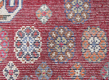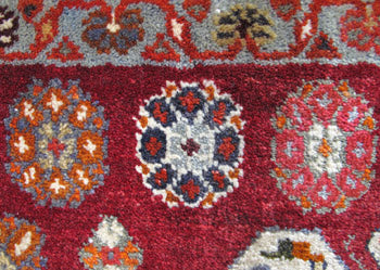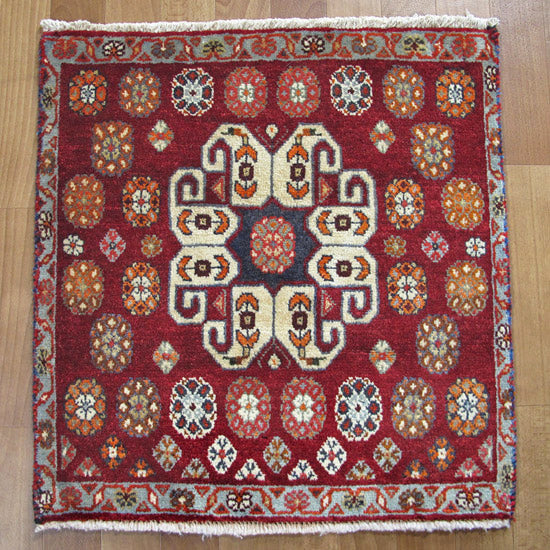 枯れた色合いとカシュガイの伝統柄が味わいあるアンティクオールドのカシュガイ絨毯。デザイン性と温かみのある素朴な雰囲気に気分がなごみます。カシュガイ絨毯の厚みは、だいたい10ミリ前後で、細手の糸のさらりとした毛足感。玄関や足元マットのほか、座布団や壁飾りとして、インテリア上級者に取り入れて頂きたいアイテムです。こちらは、織りの細かな作りです。